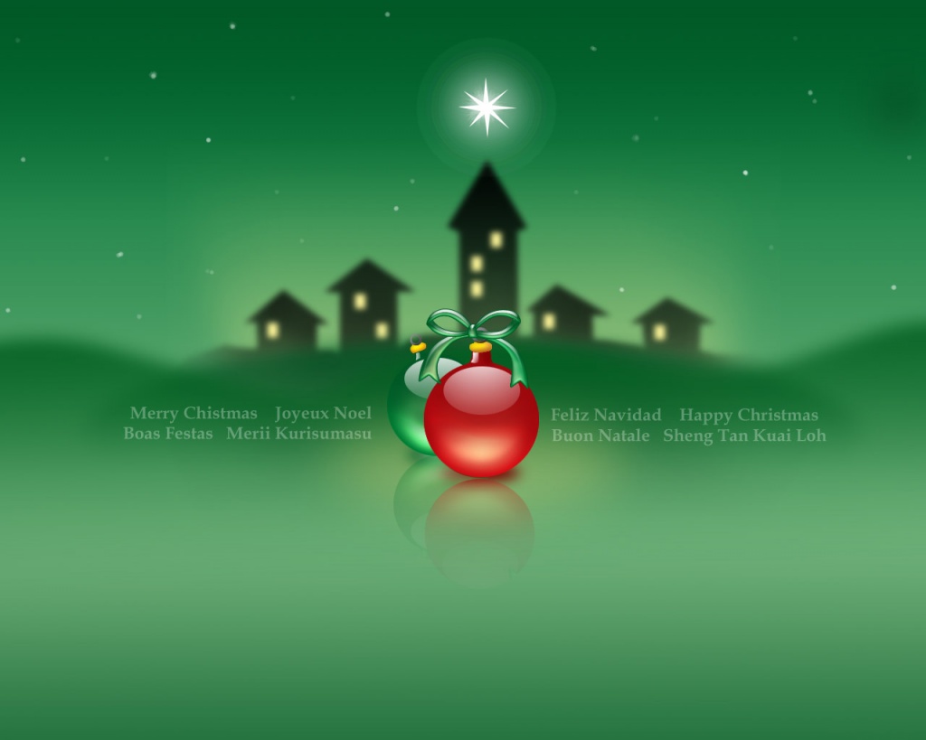 Description: A christmas card with a red apple and a green background with a house and a star in the sky.