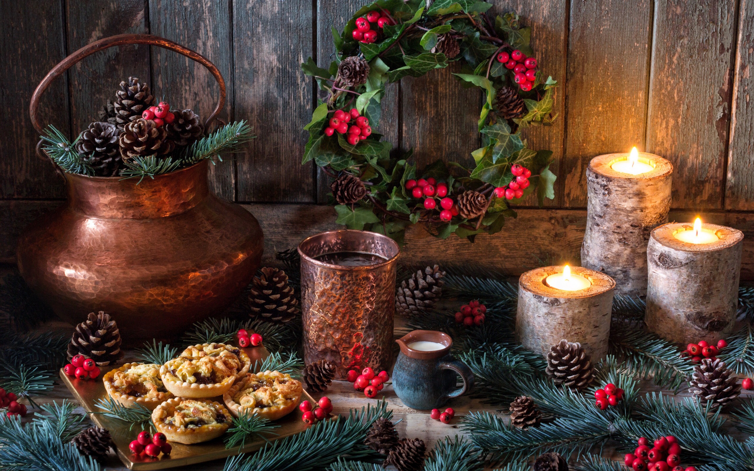 Description: A table topped with candles and christmas decorations next to a wreath and wreath wreaths on a table with pine cones.