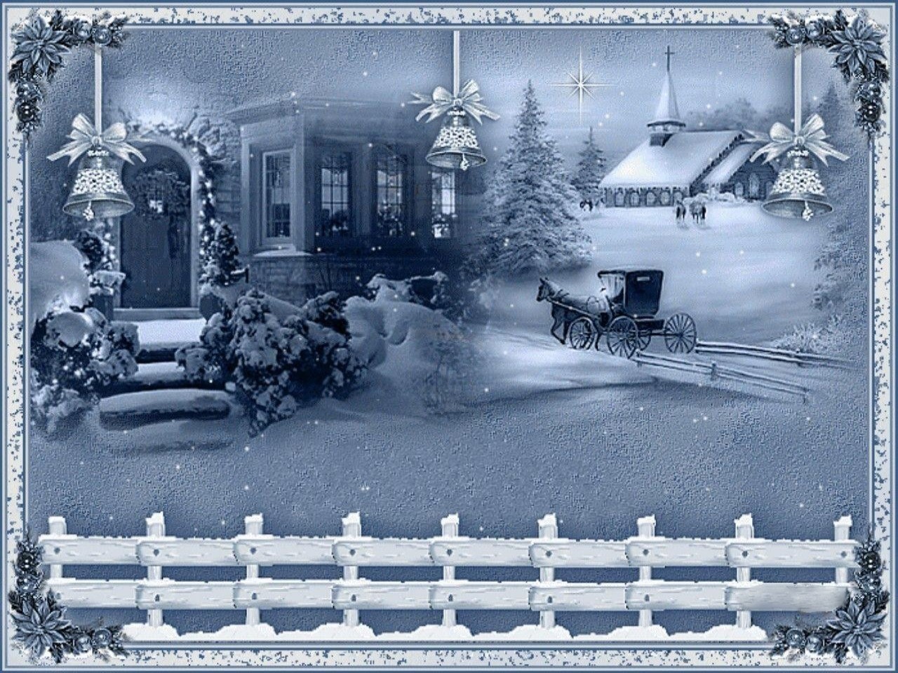 Description: A christmas card with a horse drawn carriage in the snow and a church in the background with bells on it.