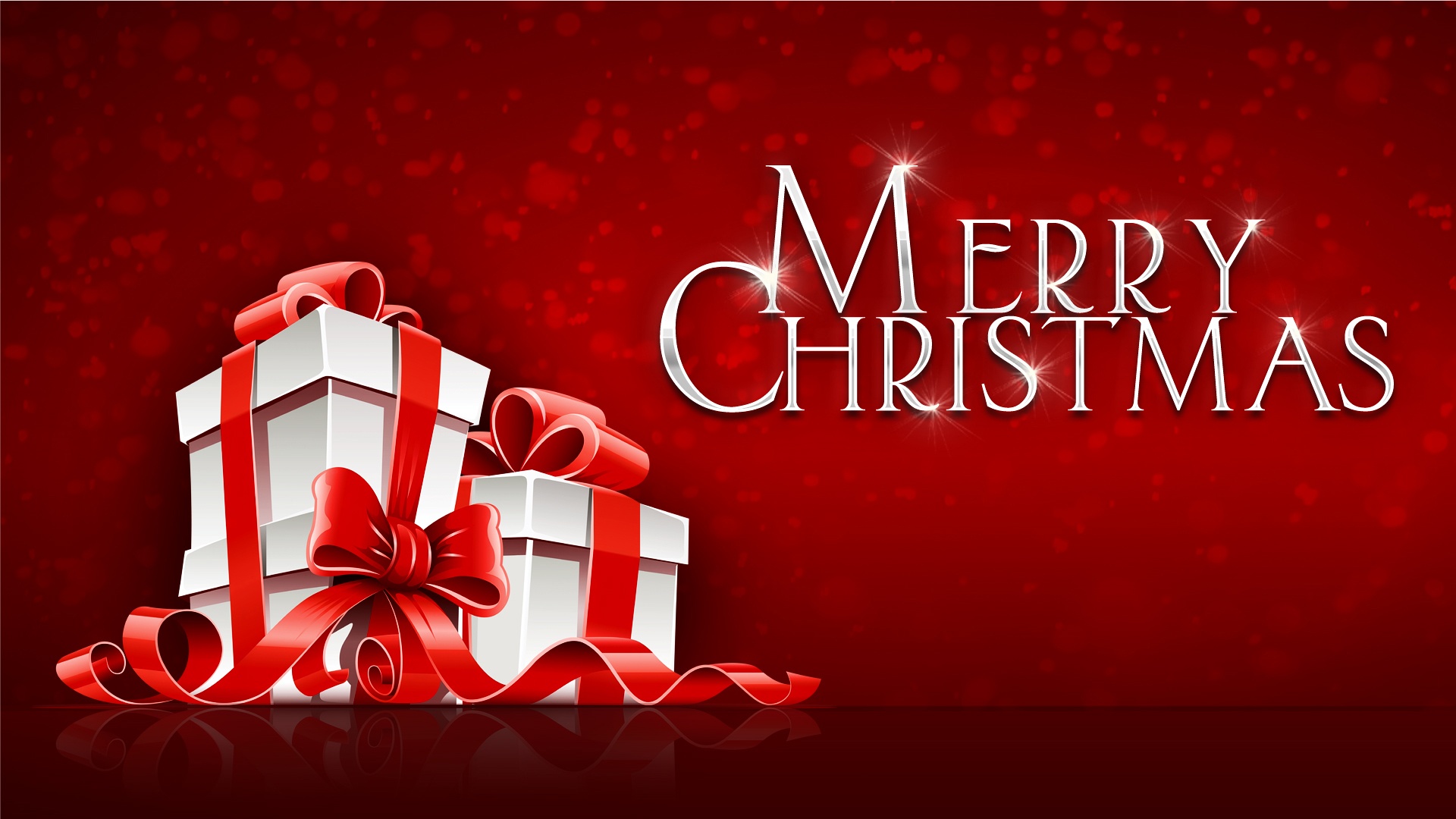Description: A red and white christmas card with presents on it and a merry christmas message in the middle of the card.