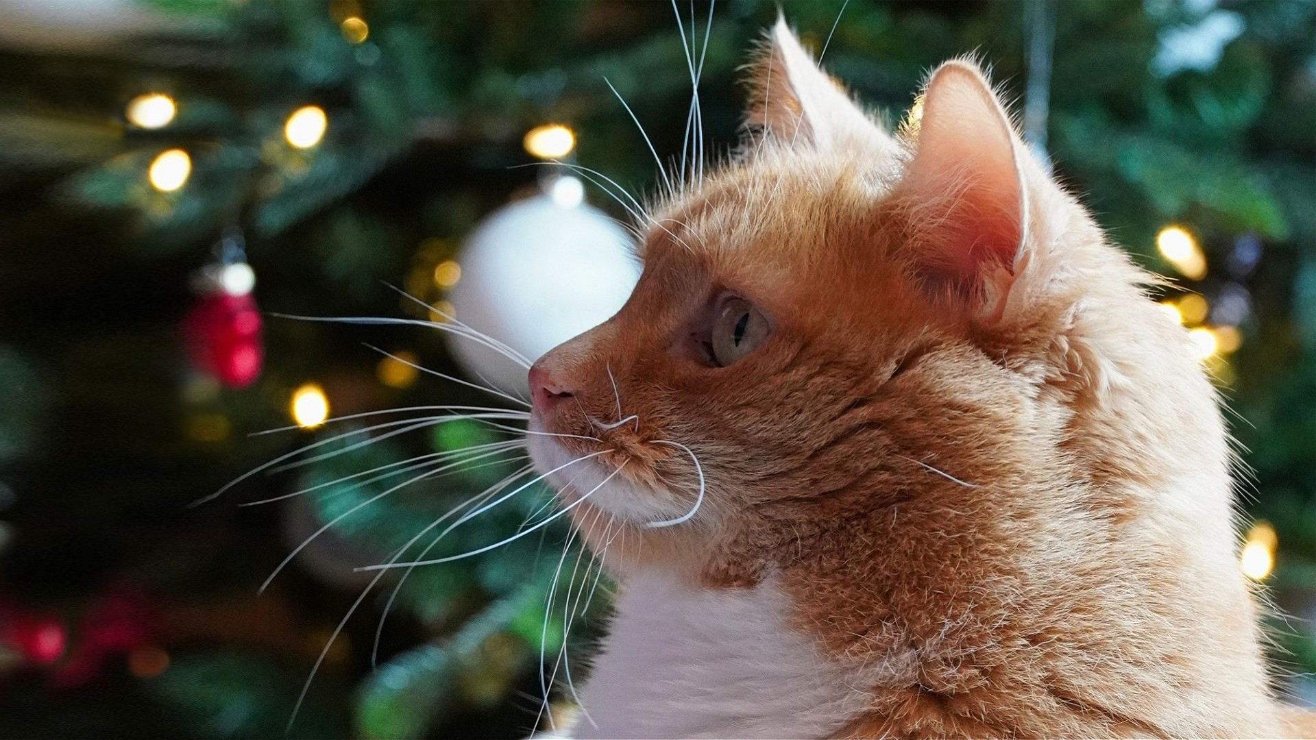 Description: A cat sitting in front of a christmas tree with a lite up christmas tree in the background and a lite up christmas tree.