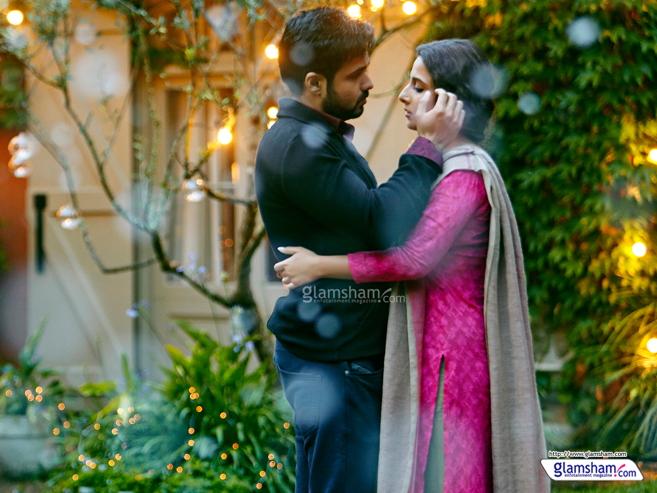 Description: A man and woman dressed in costume standing next to each other in front of a house with christmas lights.