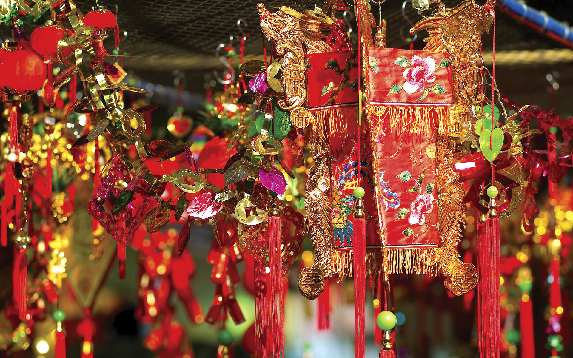 Description: A group of red and gold decorations hanging from a ceiling with lights on them and decorations hanging from the ceiling.