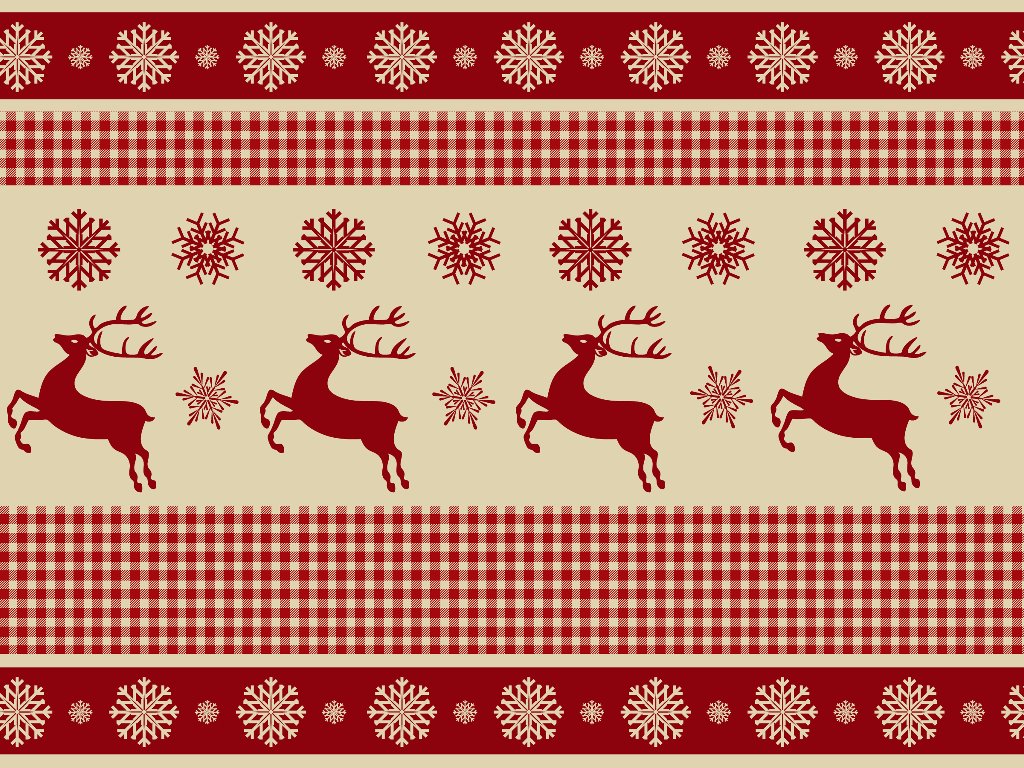 Description: A christmas themed pattern with deers and snowflakes on a red and beige background with snowflakes.