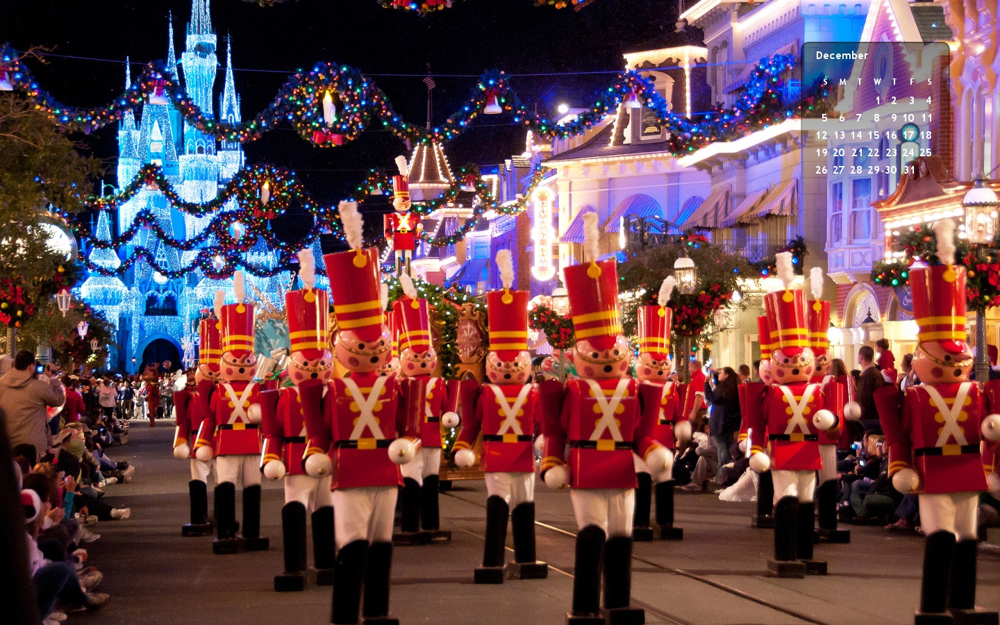Description: A parade of christmas decorations and nutcrackers in front of a castle at night time with lights.
