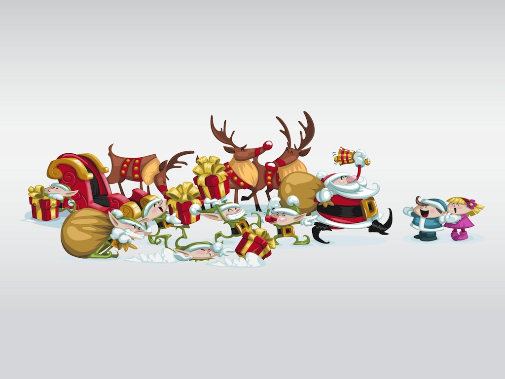 Description: A christmas scene with santa claus and reindeers with gifts and gifts in the snow and a santa clause.