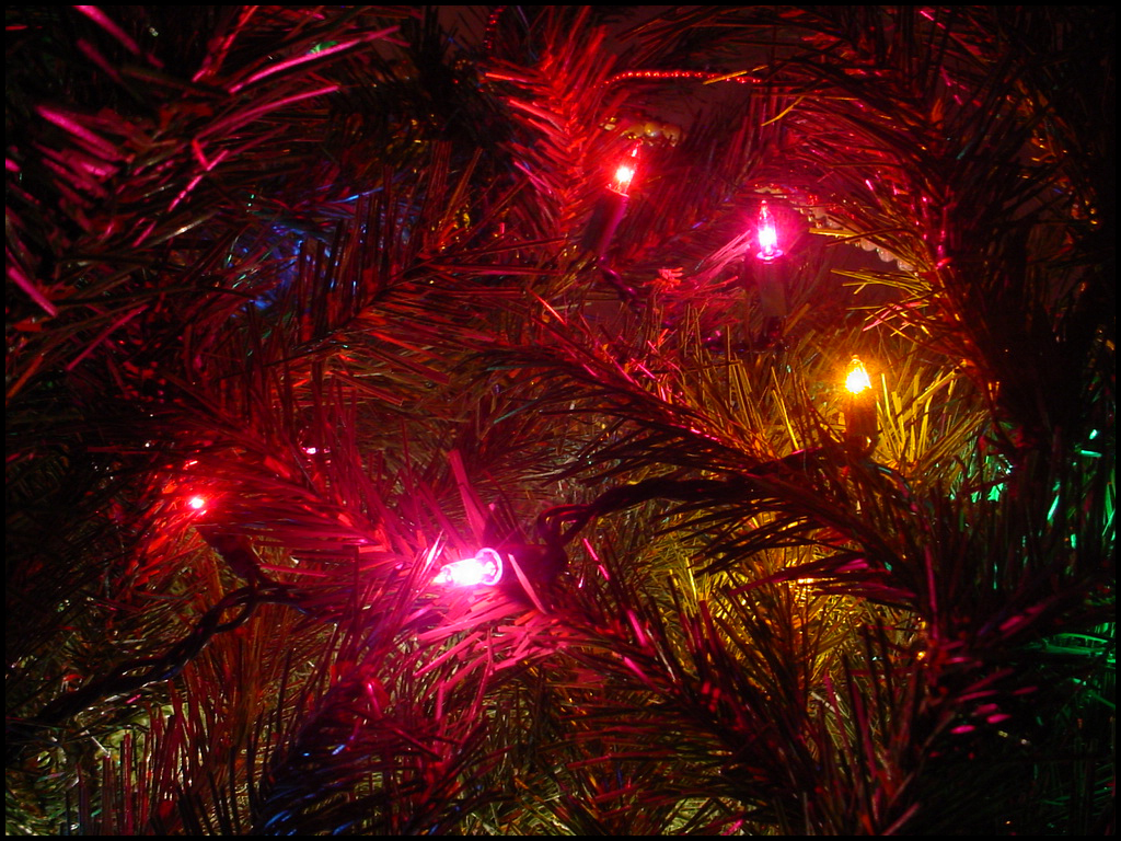 Description: A close up of a christmas tree with lights on it's branches and a red ornament.
