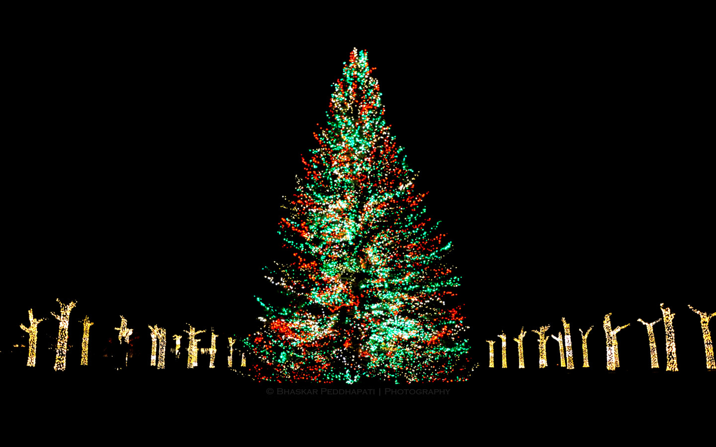 Description: A large christmas tree lit up in the dark with lights on it's sides and a man standing in front of it.