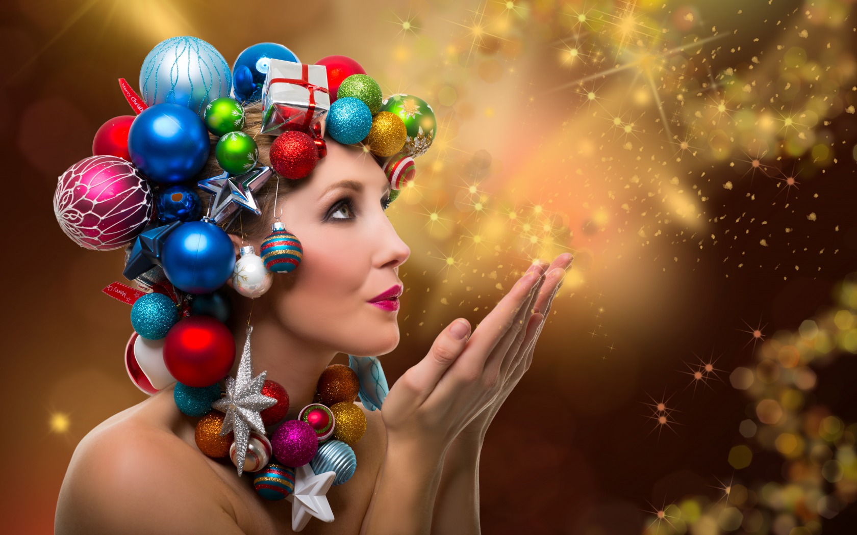 Description: A woman with a christmas wreath on her head and a lot of ornaments on her head.