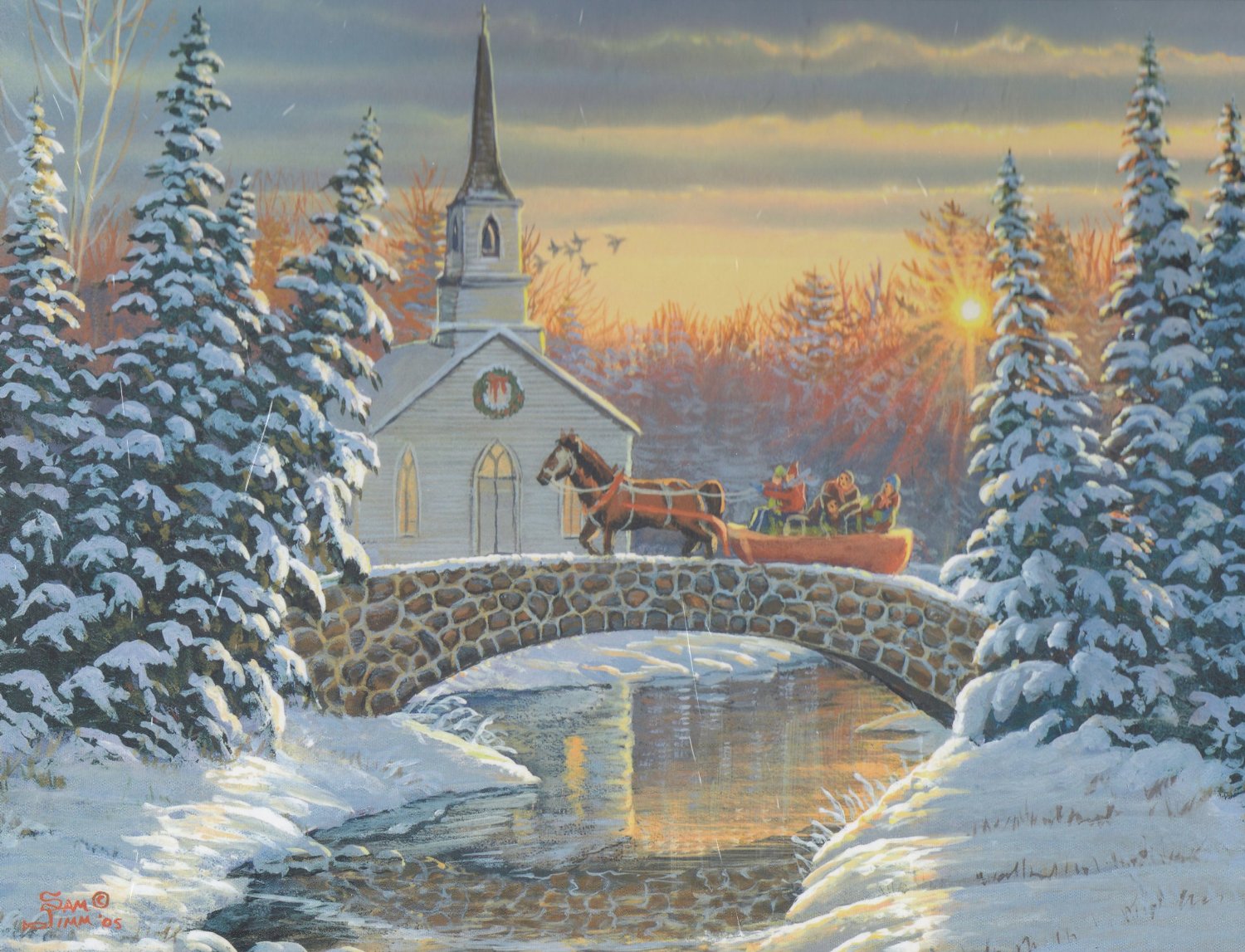 Description: A painting of a church and a bridge with a horse drawn carriage crossing it in the snow with a church in the background.