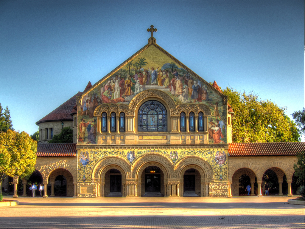 Description: A church with a large painting on the front of it's building and a clock tower in the background.