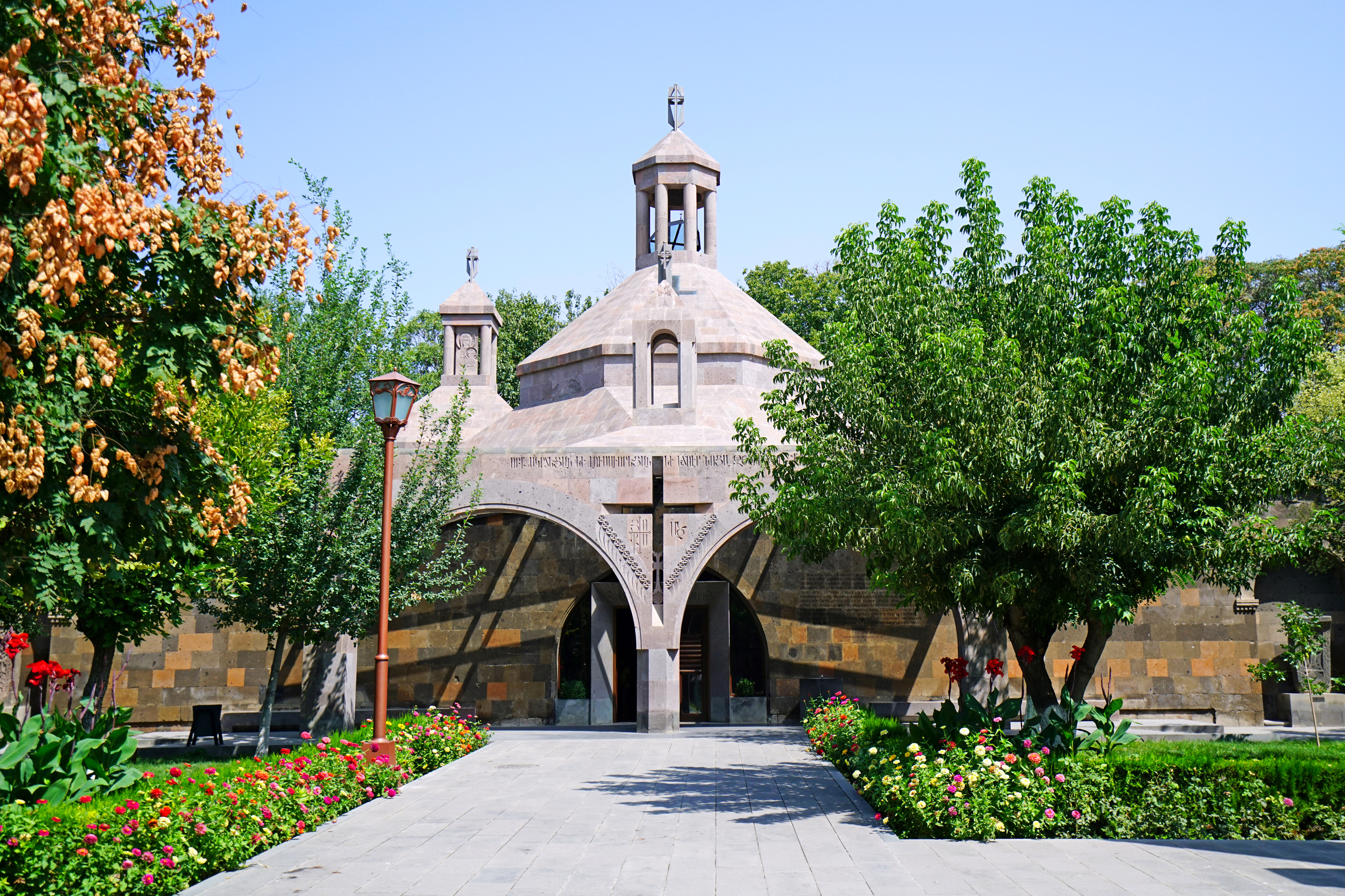 Description: A church with a cross on the front of it surrounded by trees and flowers and a walkway leading to it.