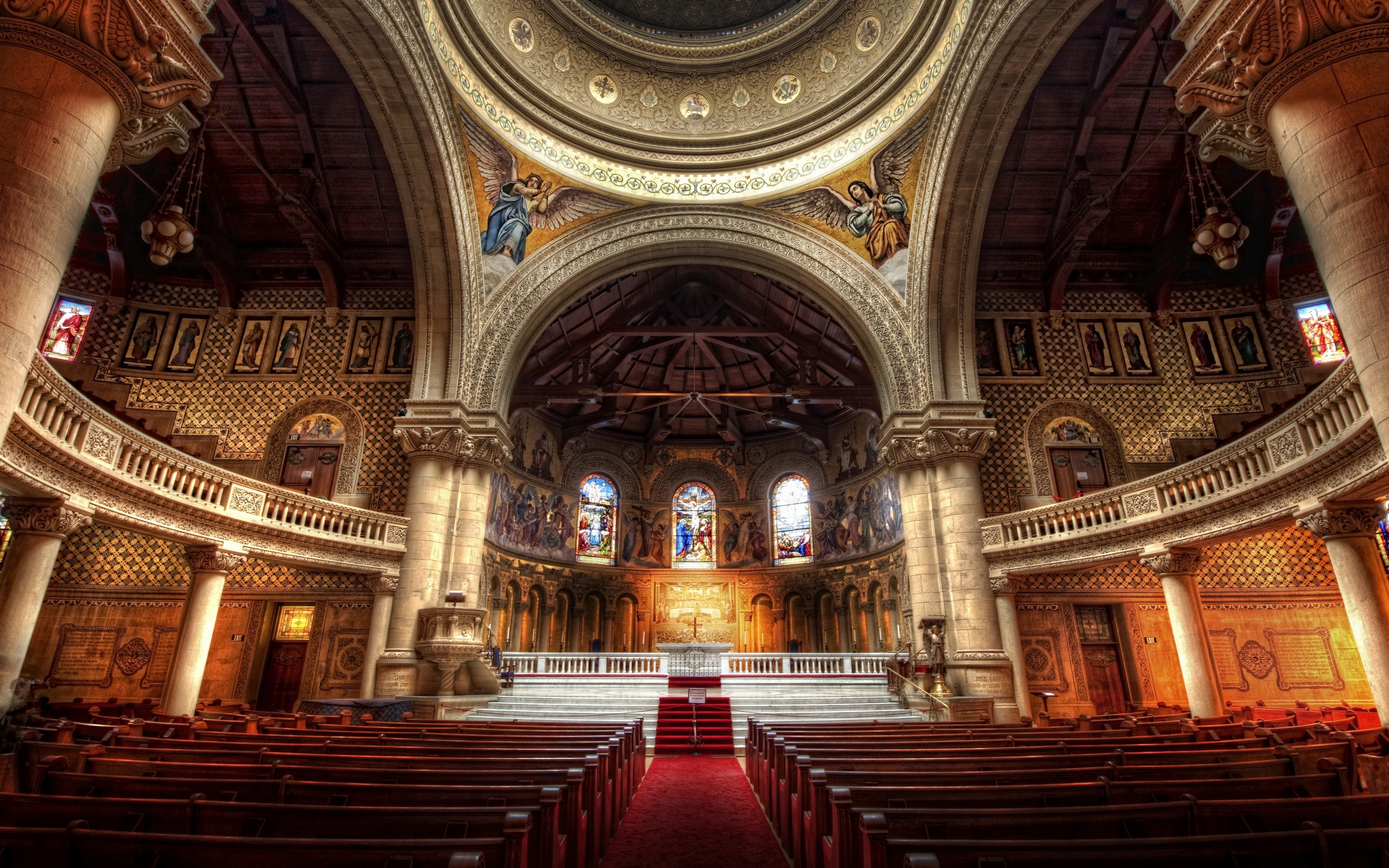 Description: A church with a large dome and a red carpeted floor and a red carpeted floor and a red carpeted floor.