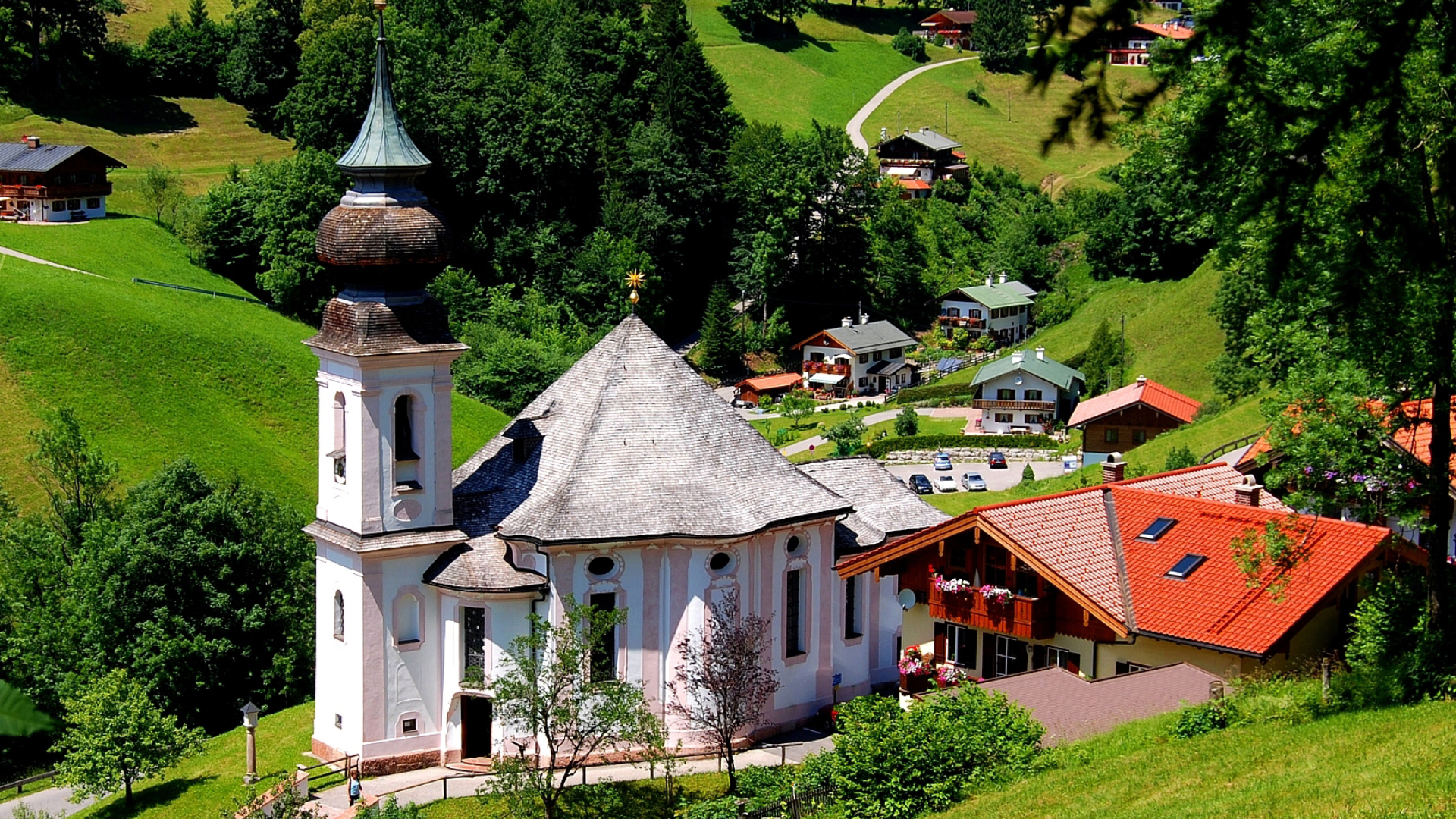 Description: A church in a green valley surrounded by trees and hills with a steeple on top of it and a red roof.