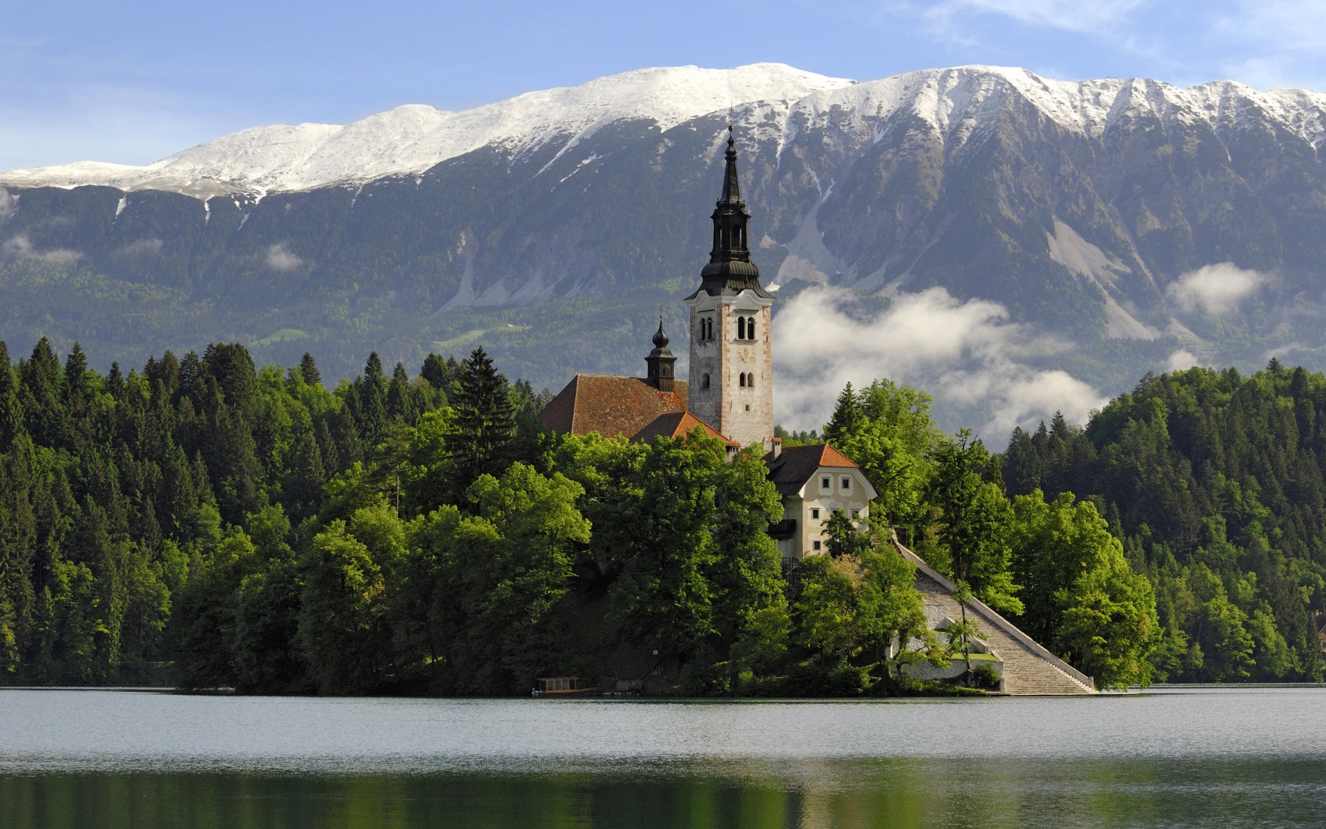 Description: A church on a small island in the middle of a lake with a mountain in the background and clouds in the sky.