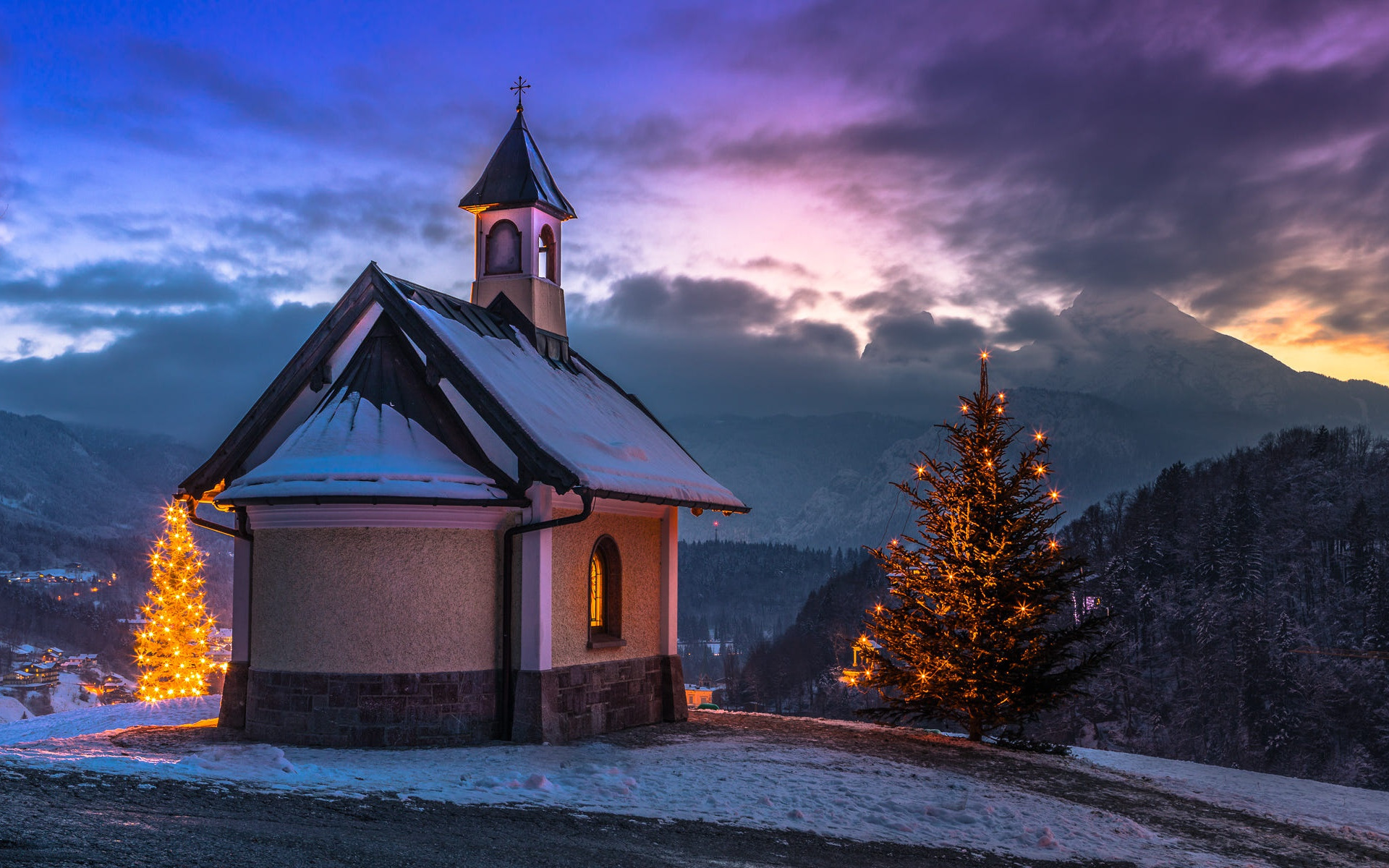 Description: A church with a lit christmas tree on top of it in the mountains at night time with a purple sky.