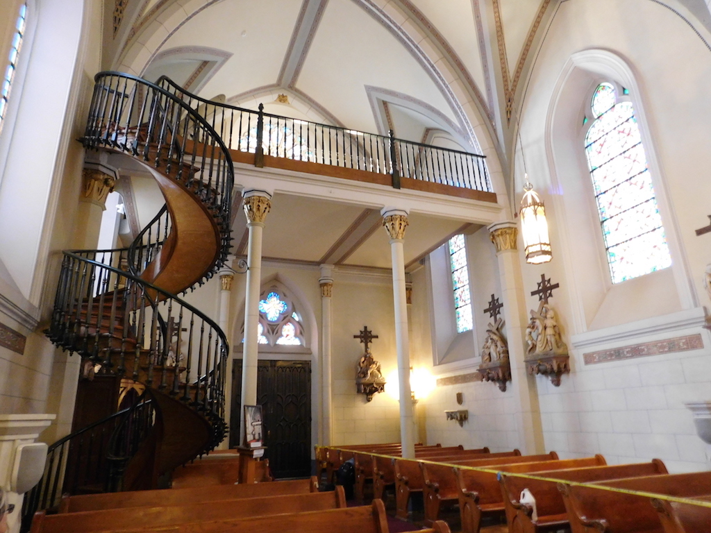 Description: A church with a spiral staircase and stained glass windows on the walls and ceiling.