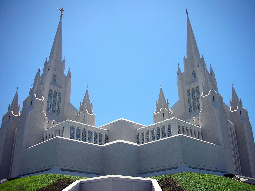 Description: A church with a steeple and a steeple on the side of it with a clock on the front.