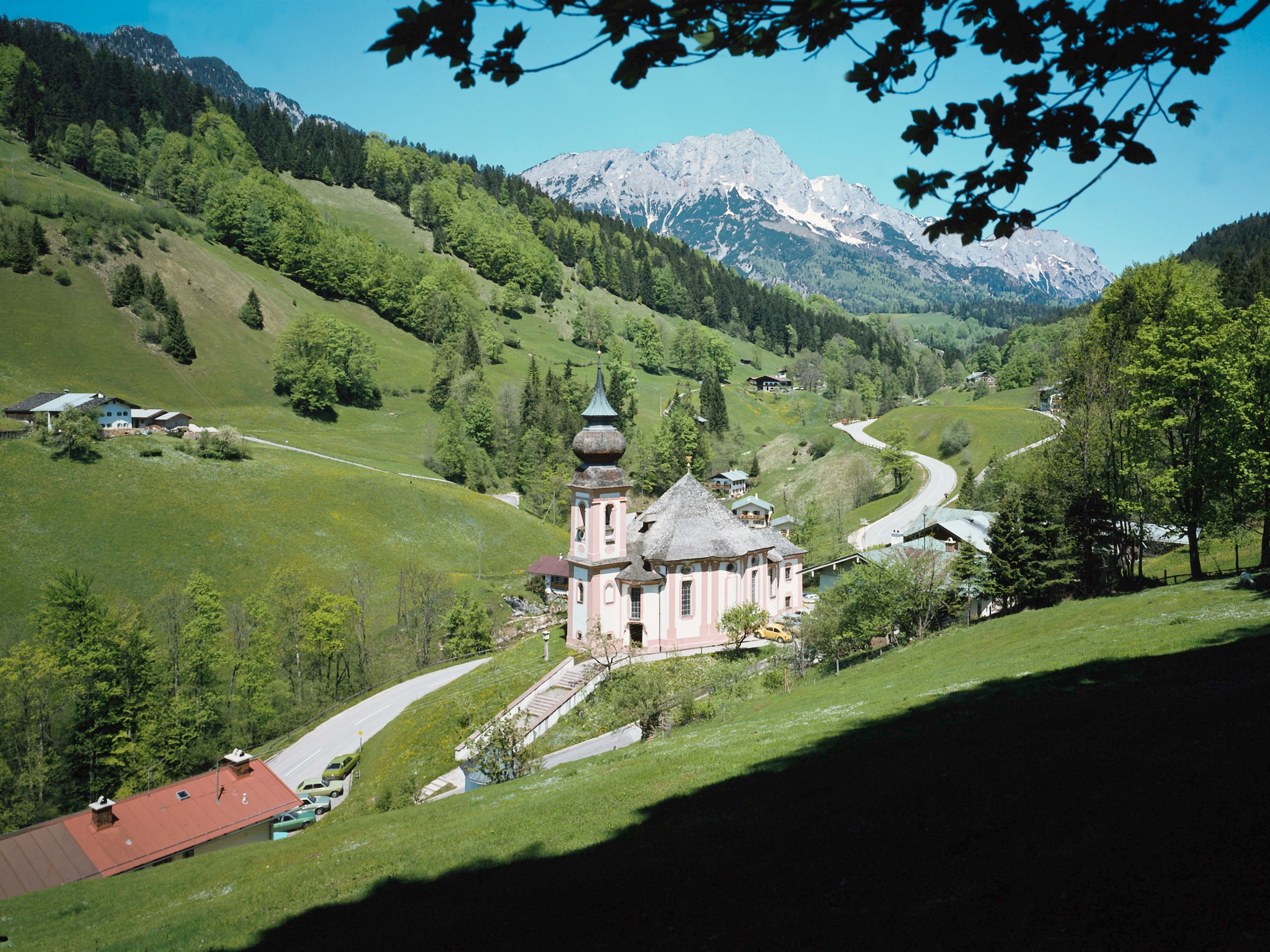 Description: A church in a valley with a mountain in the background and a road winding through the valley to the right.