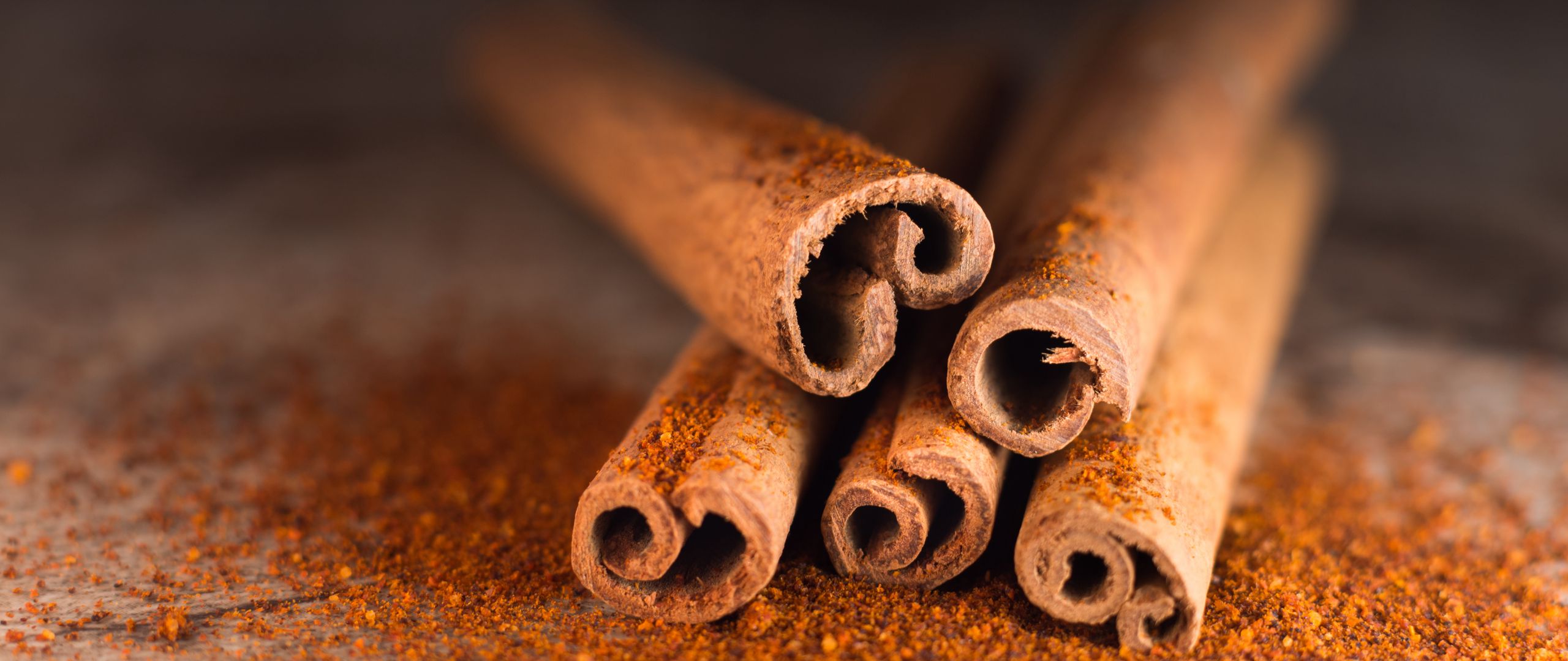 Description: Cinnamon sticks are arranged in a pile of cinnamon powdered sugar and cinnamon flakes are scattered around them.