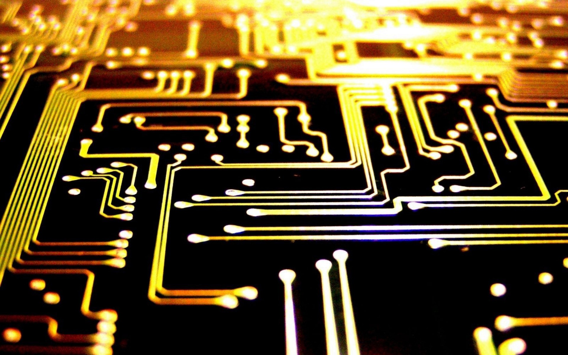 Description: A close up of a computer circuit board with yellow and black lines on it and a yellow light shining on the top of the circuit board.