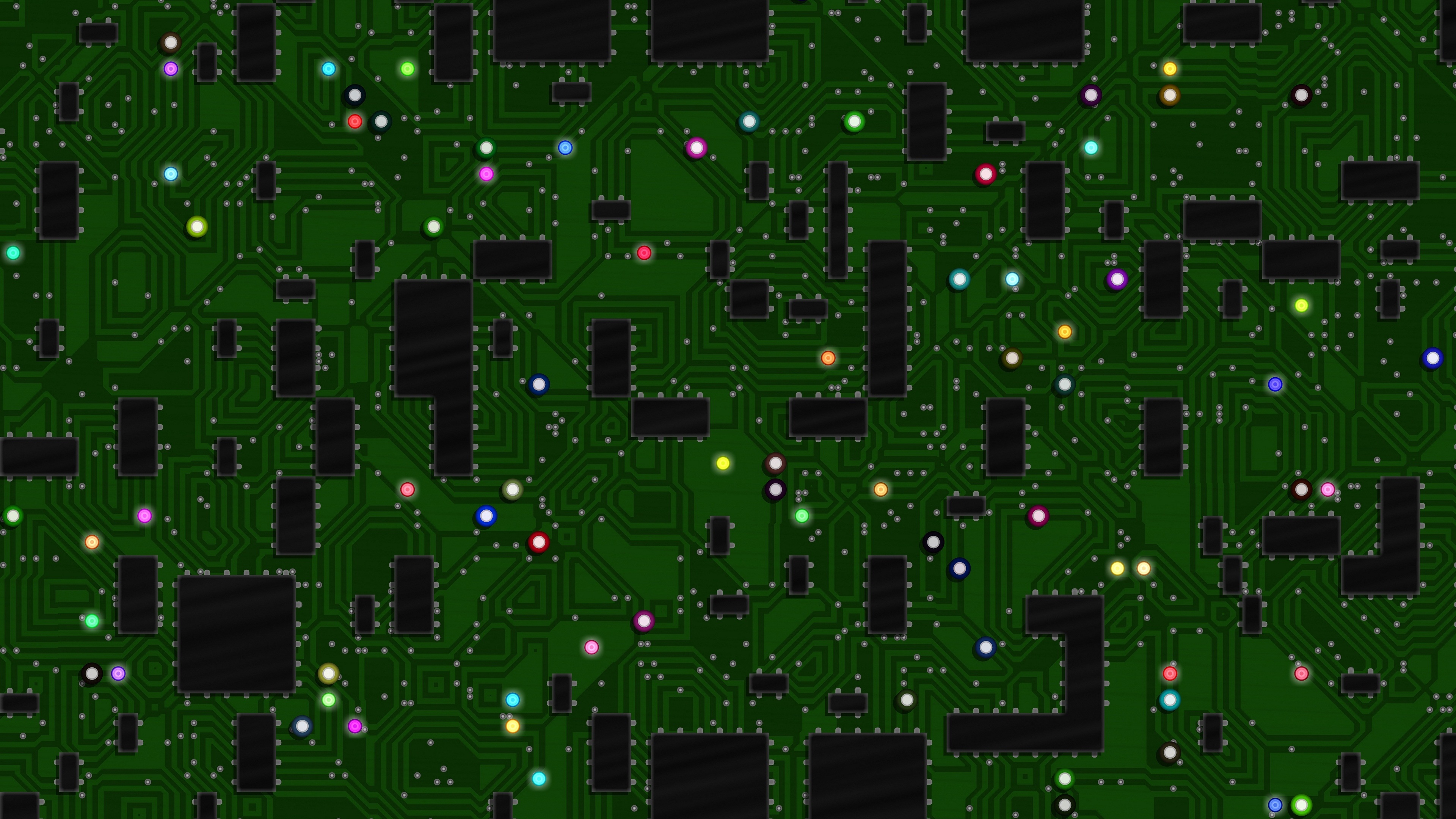 Description: A computer circuit board with many different colored dots on it and a black background with a green background and a black background with a.