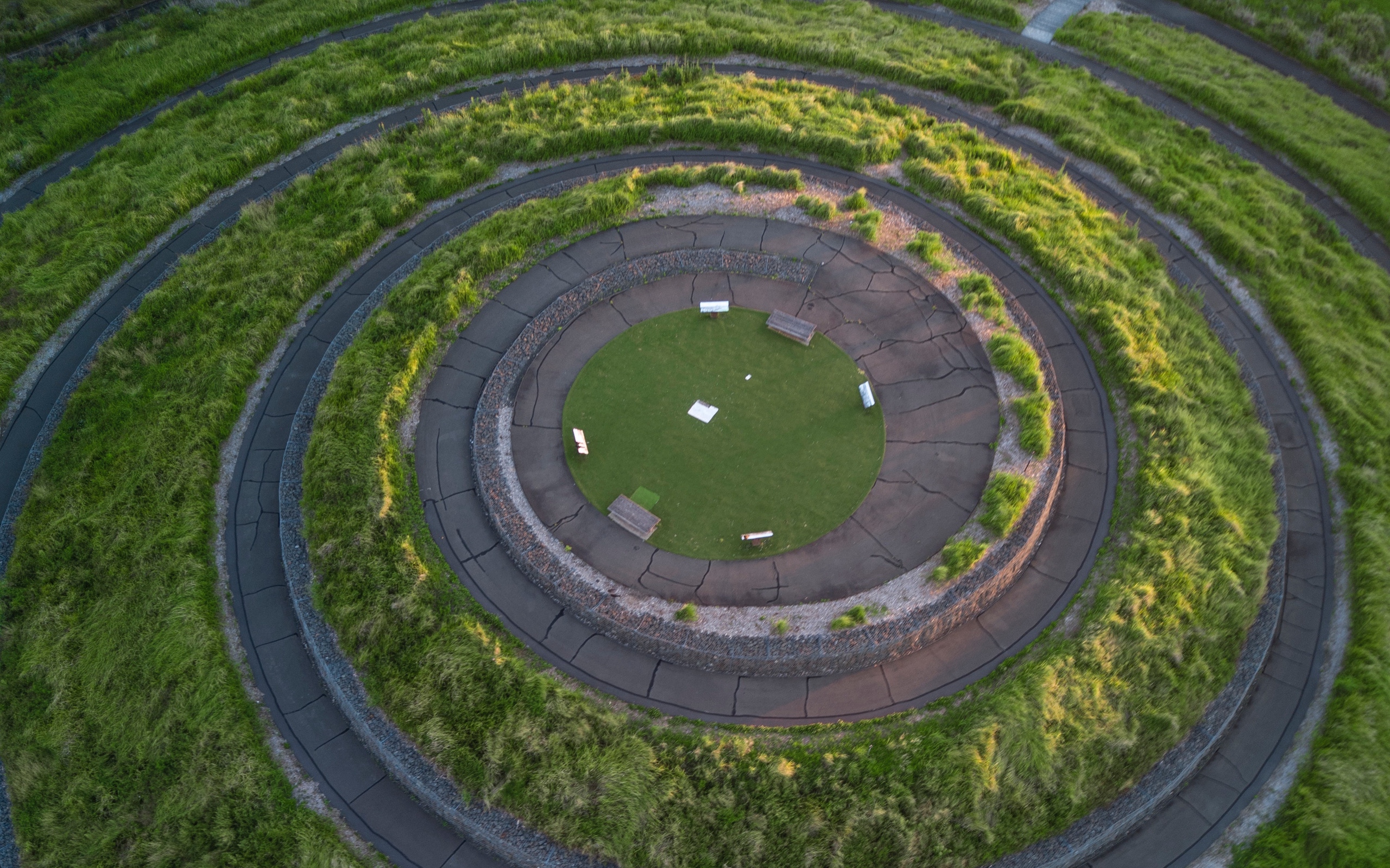 Description: A circular grassy area with a circular lawn and a circular building in the center of it.