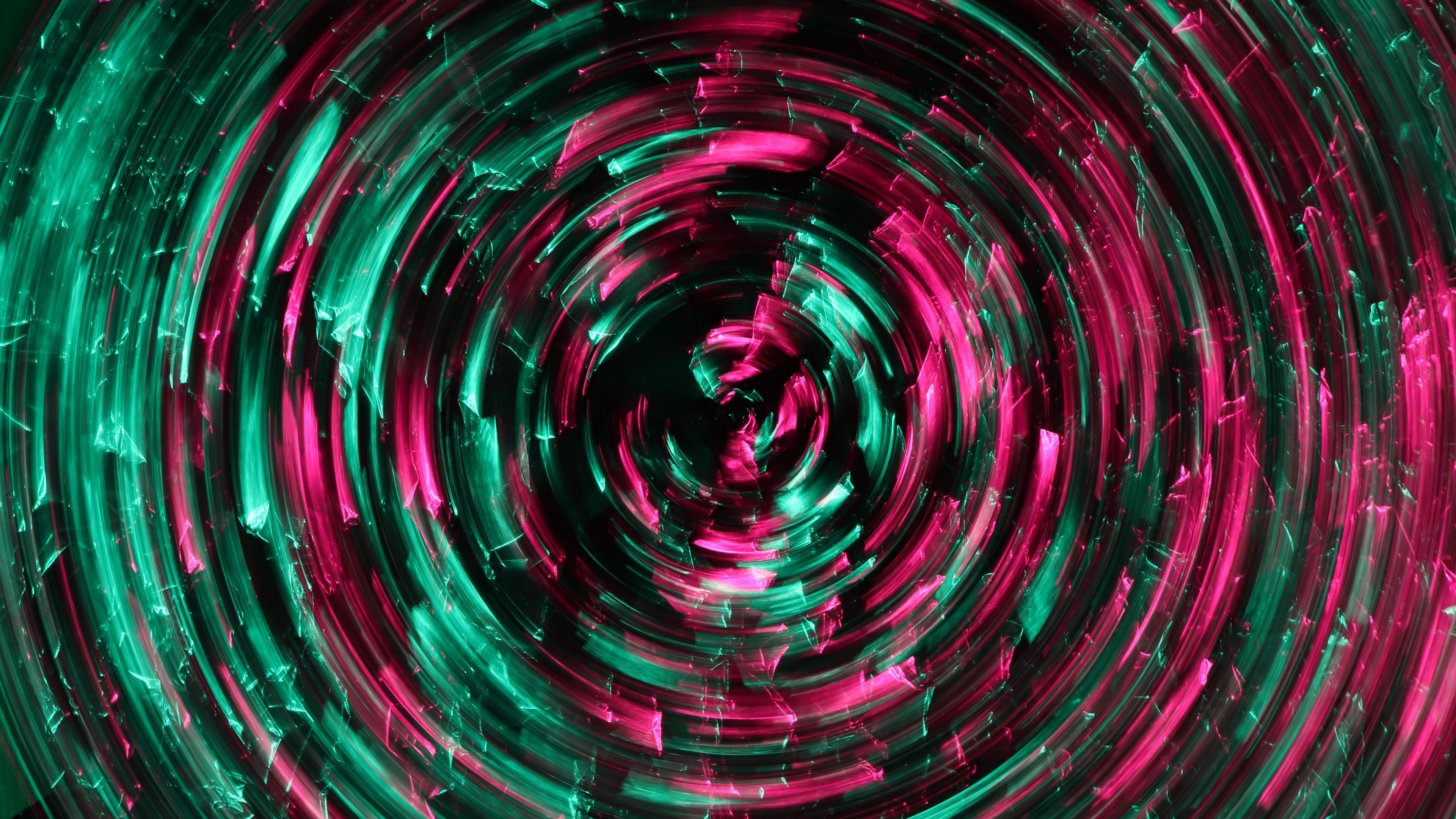 Description: A circular pattern of green and pink lights in a dark room with a black background and a red and green light.
