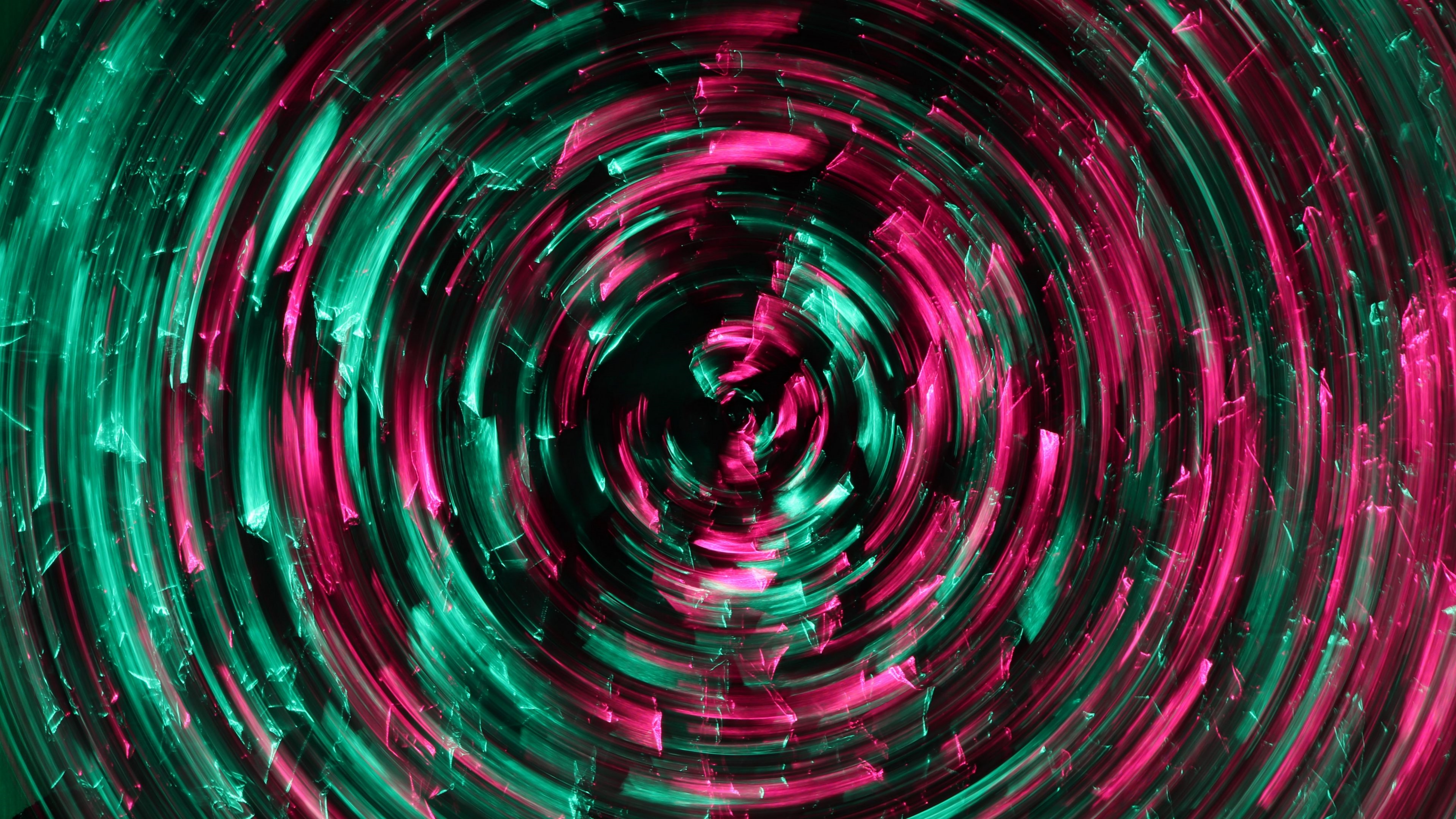 Description: A circular pattern of green and pink lights in a dark room with a black background and a red and green light.