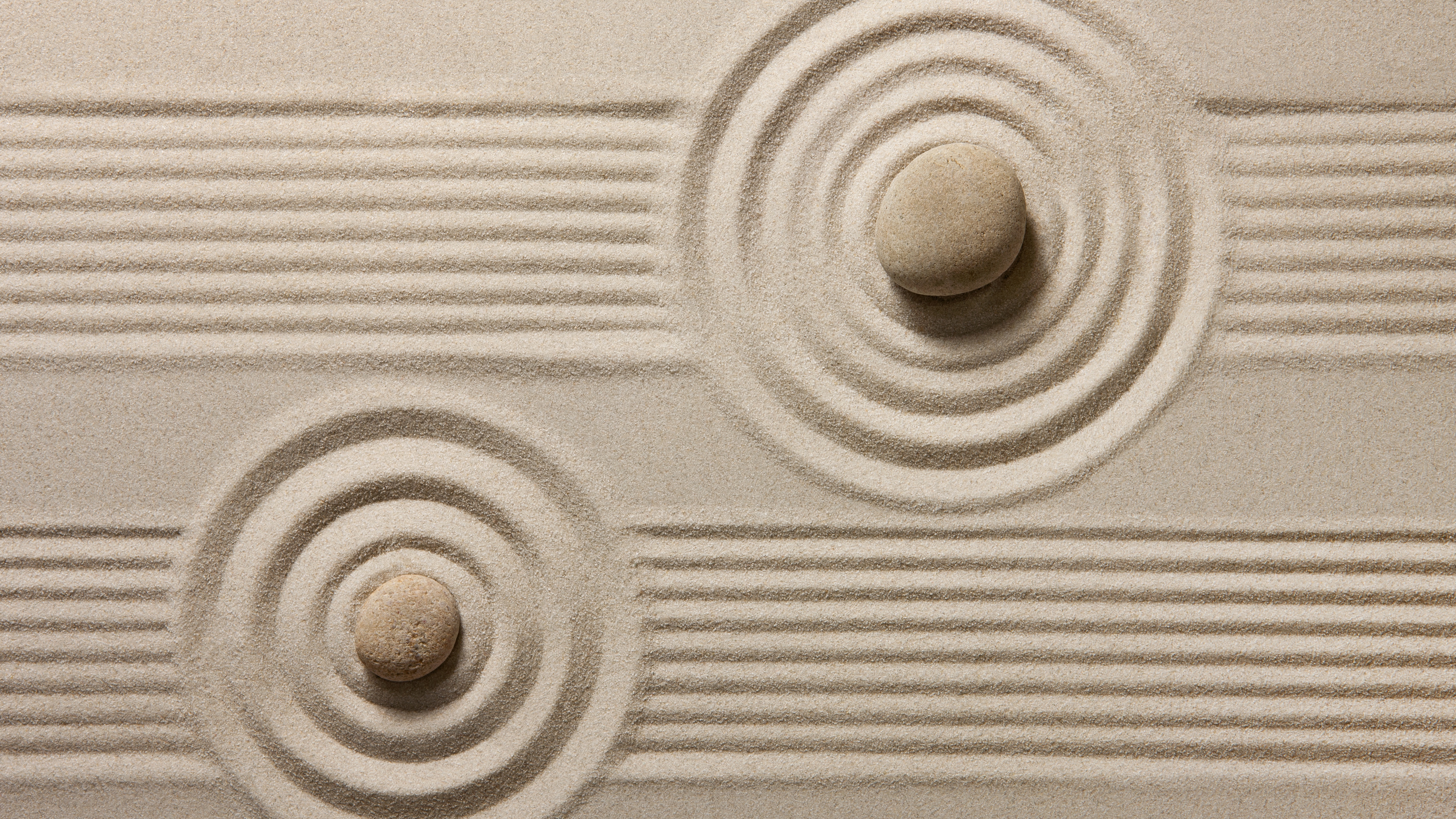 Description: Two rocks are placed in a circular pattern on a wall with a circular design on it and a smaller one in the middle.