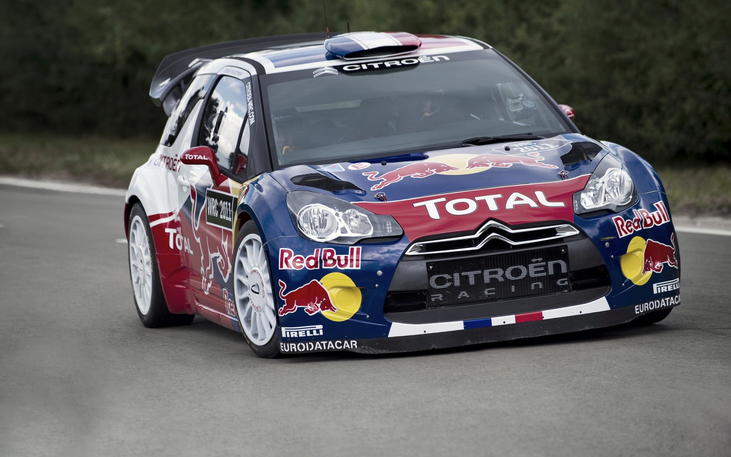 Description: A citroet rally car driving on a race track with trees in the background and a person in the front.