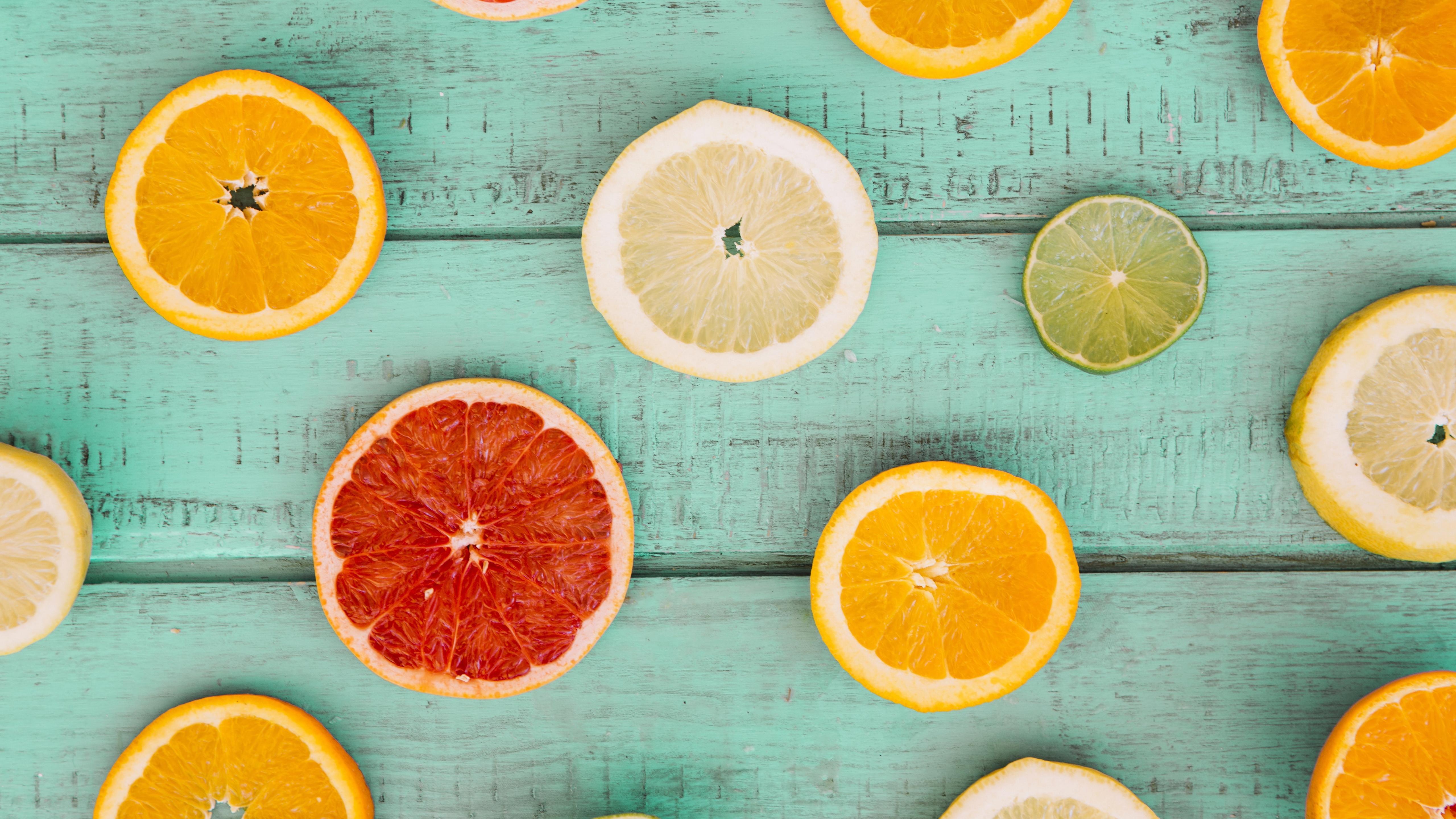 Description: A group of citrus fruits cut in half on a blue wooden table with a green background and a few oranges.