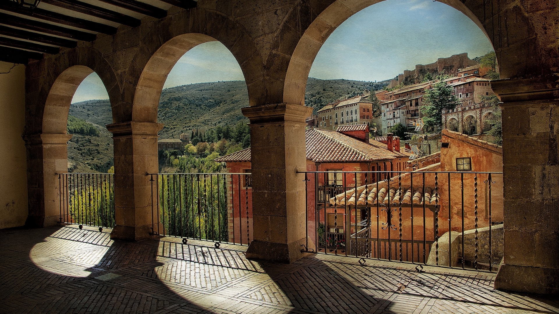 Description: A painting of a city with arches and a fence in the foreground and a view of a mountain.