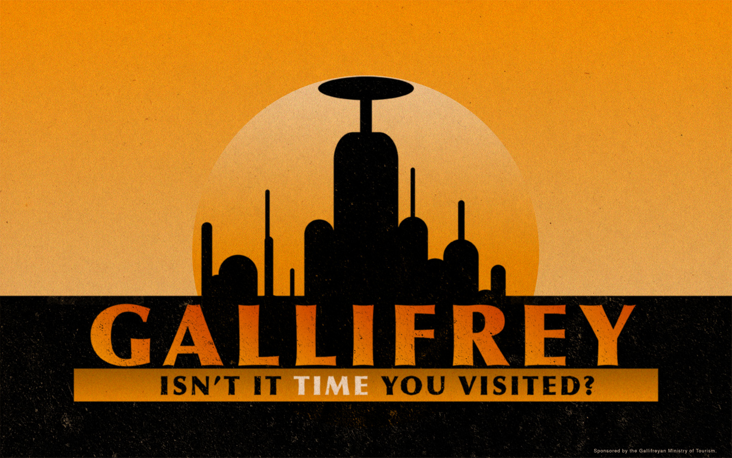 Description: A poster with a picture of a city in the background and a yellow sun in the background that says.