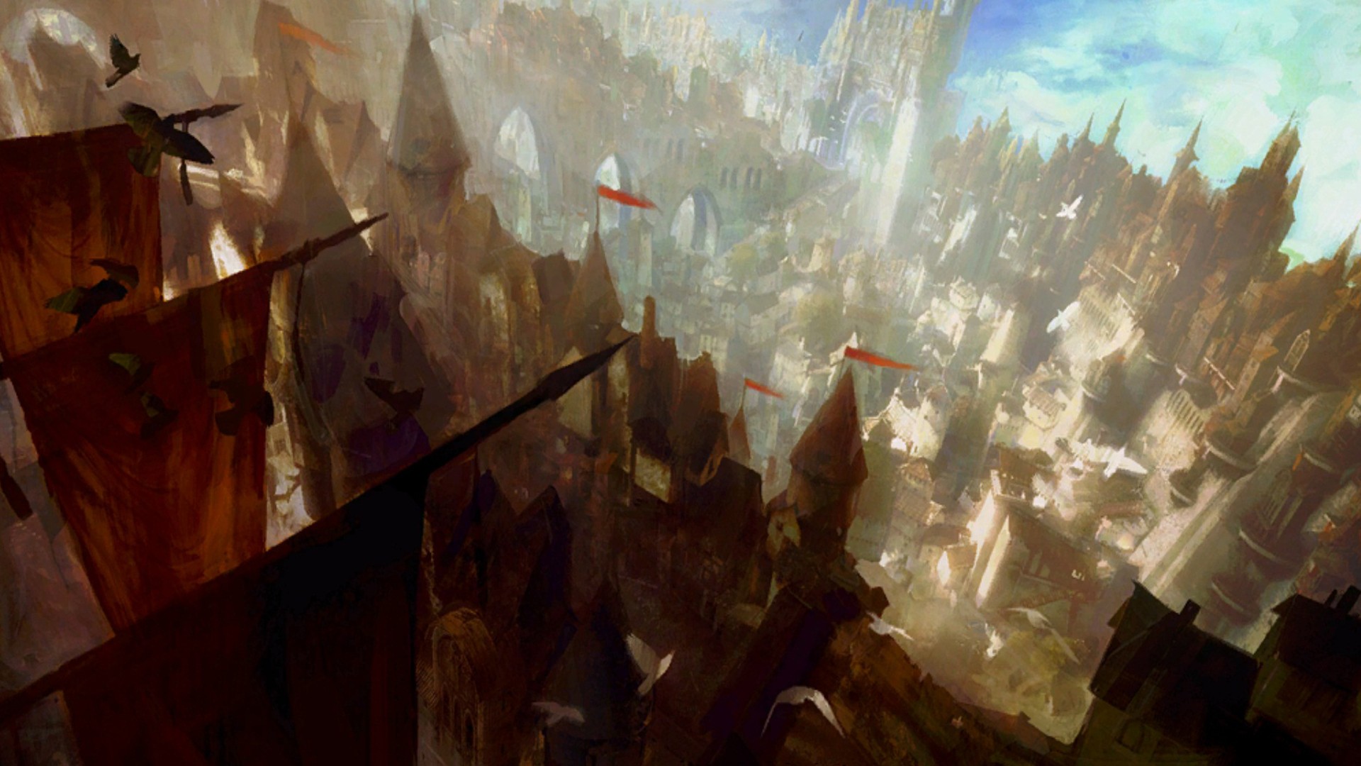 Description: A painting of a city with a bird flying over it's head and a bird flying over the city.