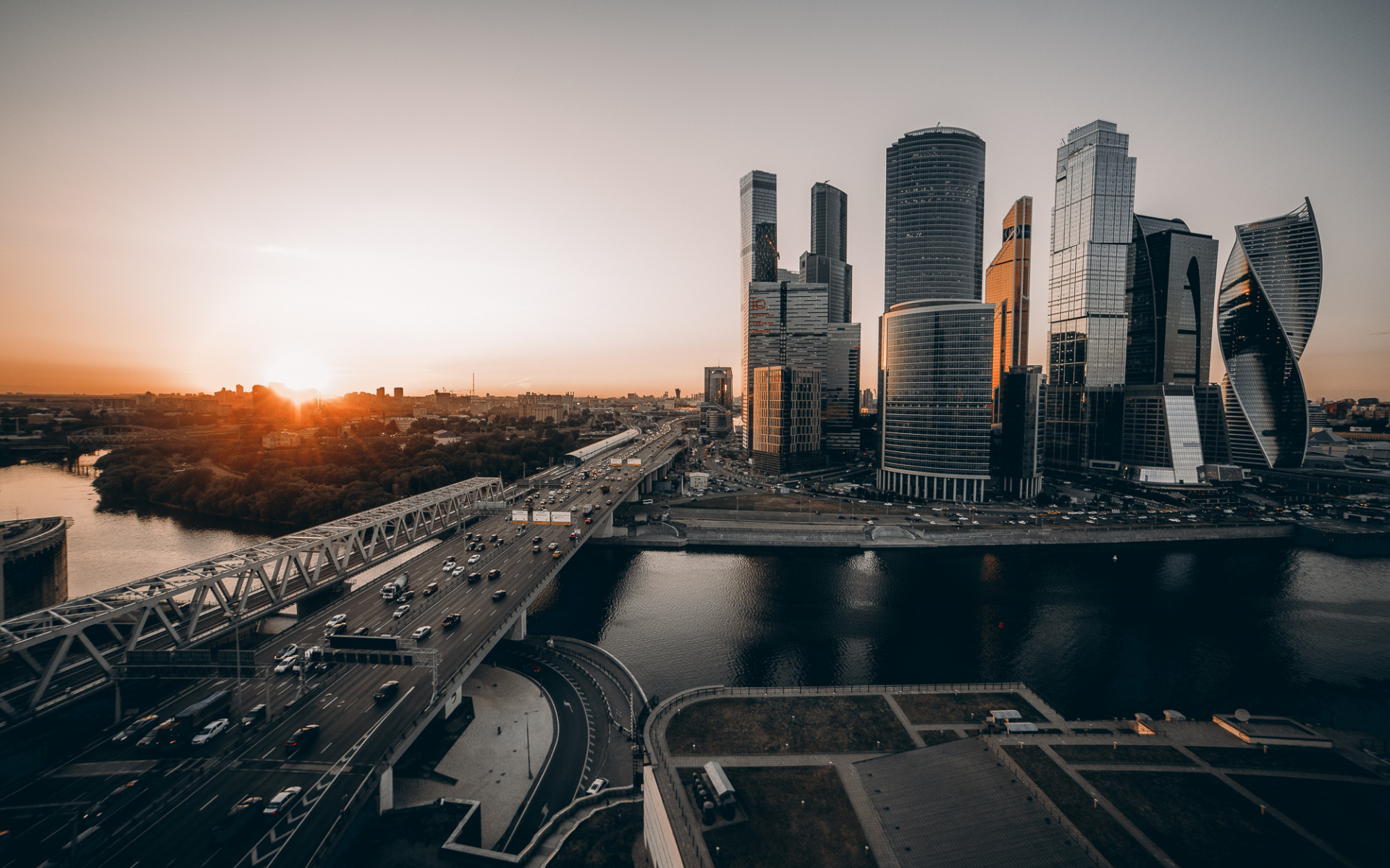 Description: A city with a bridge and a river in the foreground and a sunset in the background with a few buildings.