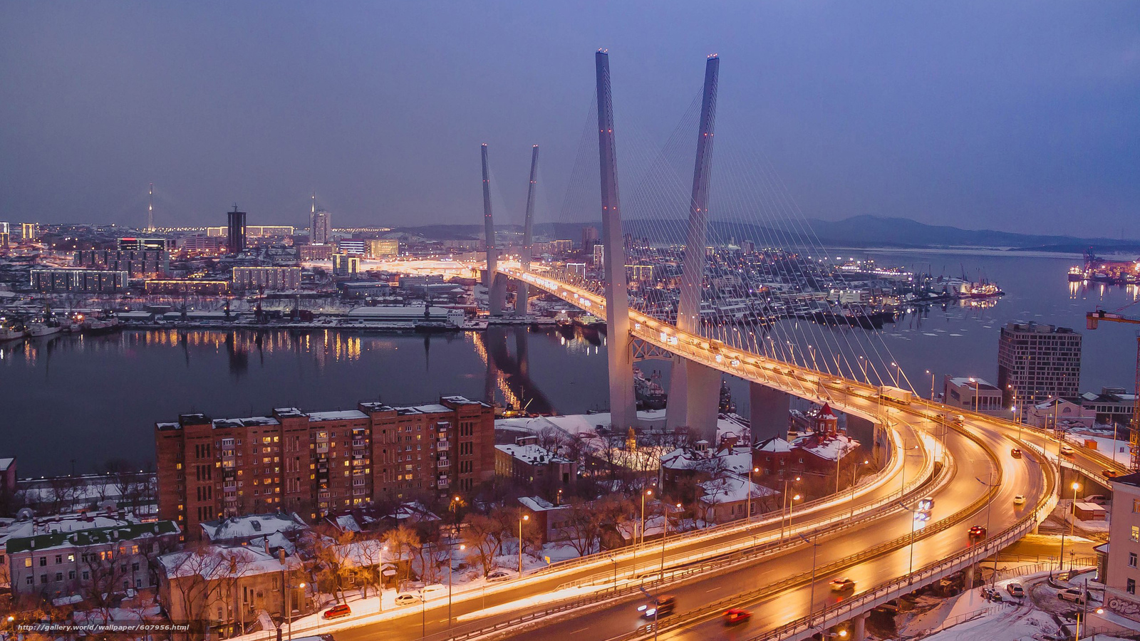 Description: A city with a bridge and a lot of traffic on it at night time with lights on the road.