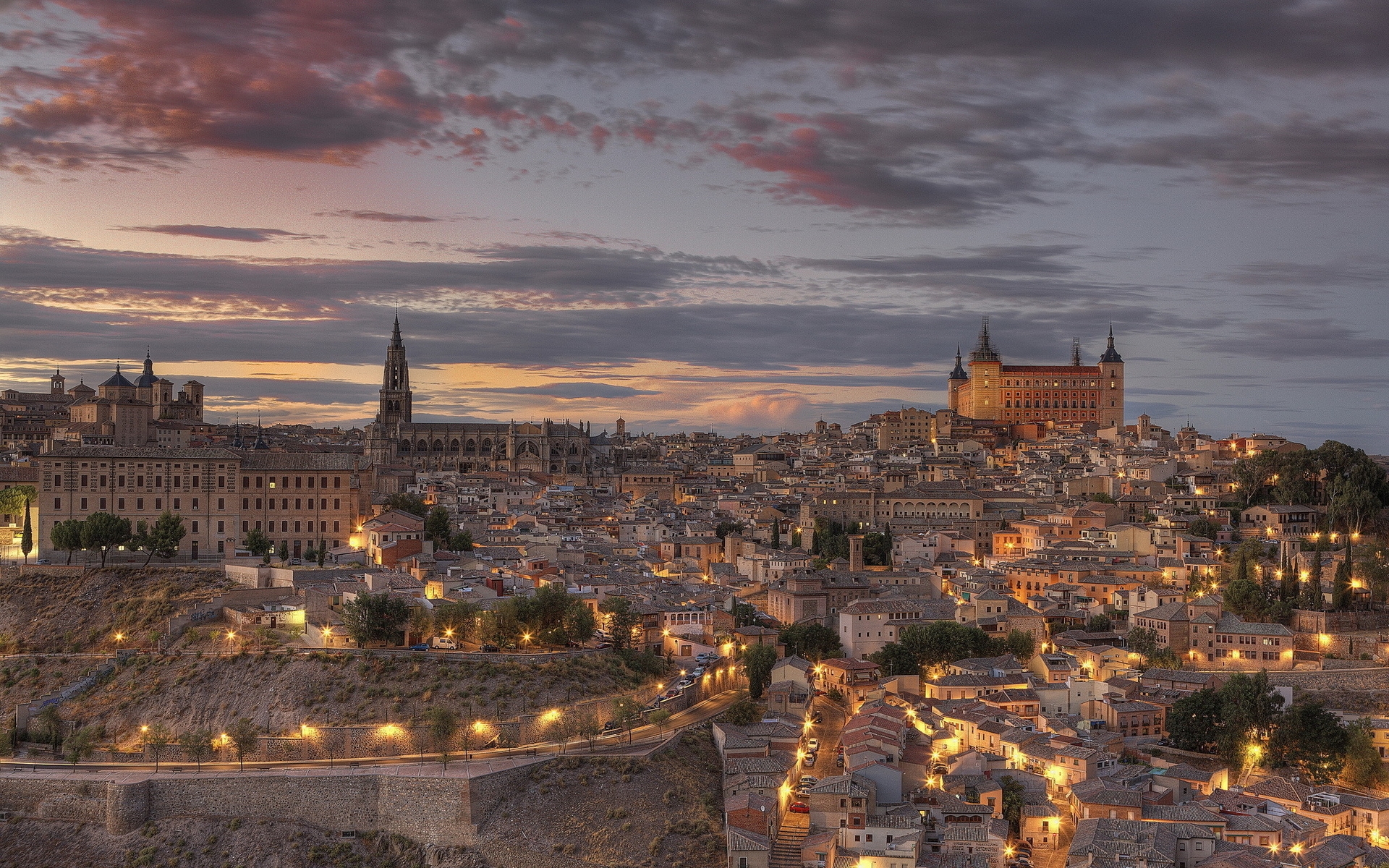 Description: A city with a castle on top of it at night time with lights on the buildings and the surrounding area.