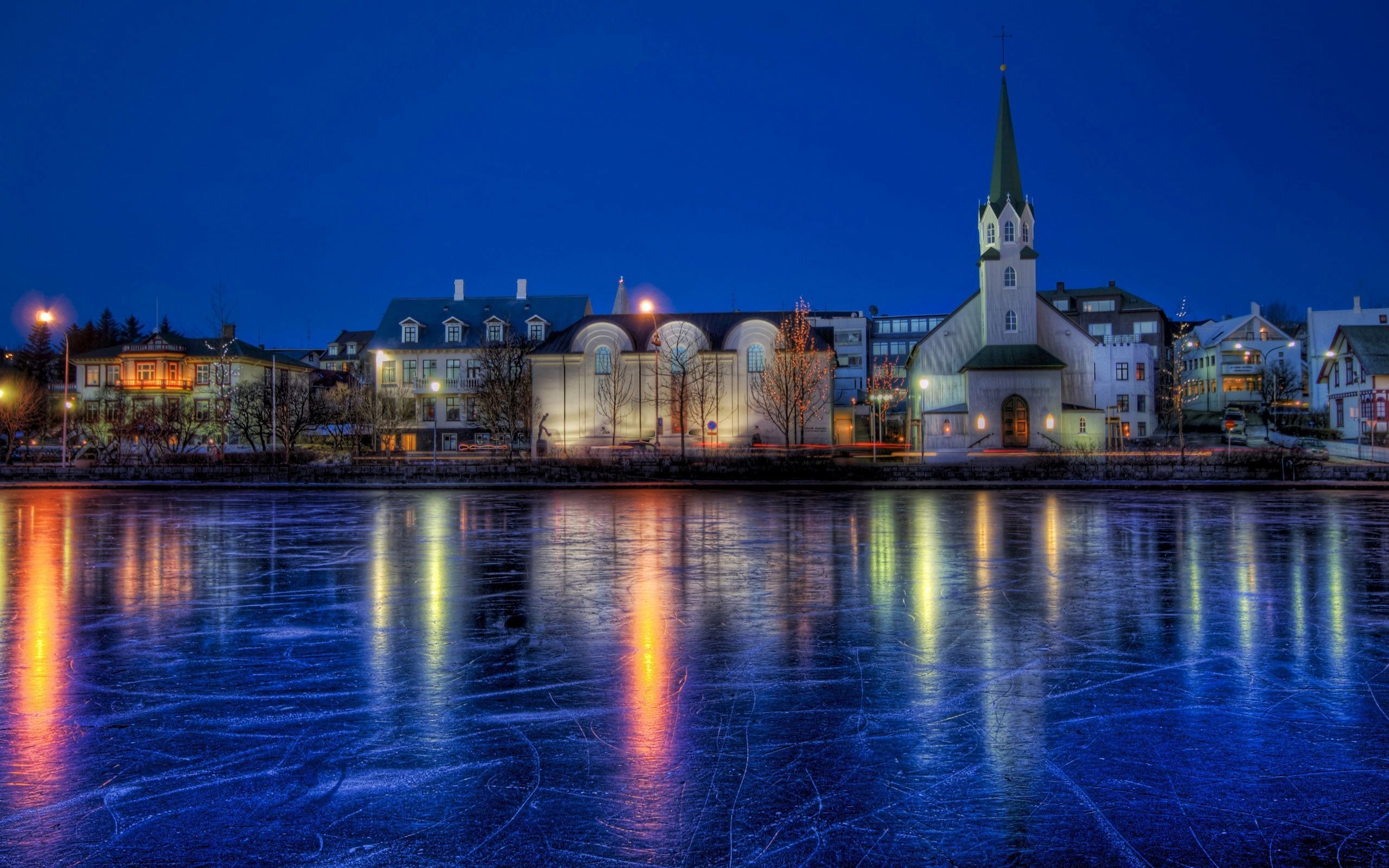 Description: A city with a church and a church tower at night on the water's edge with ice on the ground.