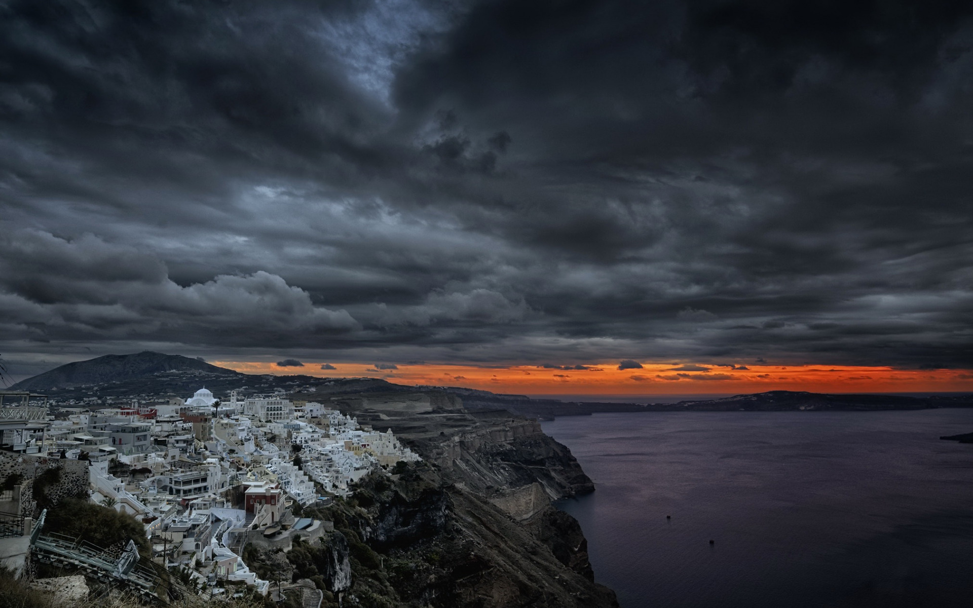 Description: A city on a cliff with a sunset in the background and dark clouds in the sky above it.