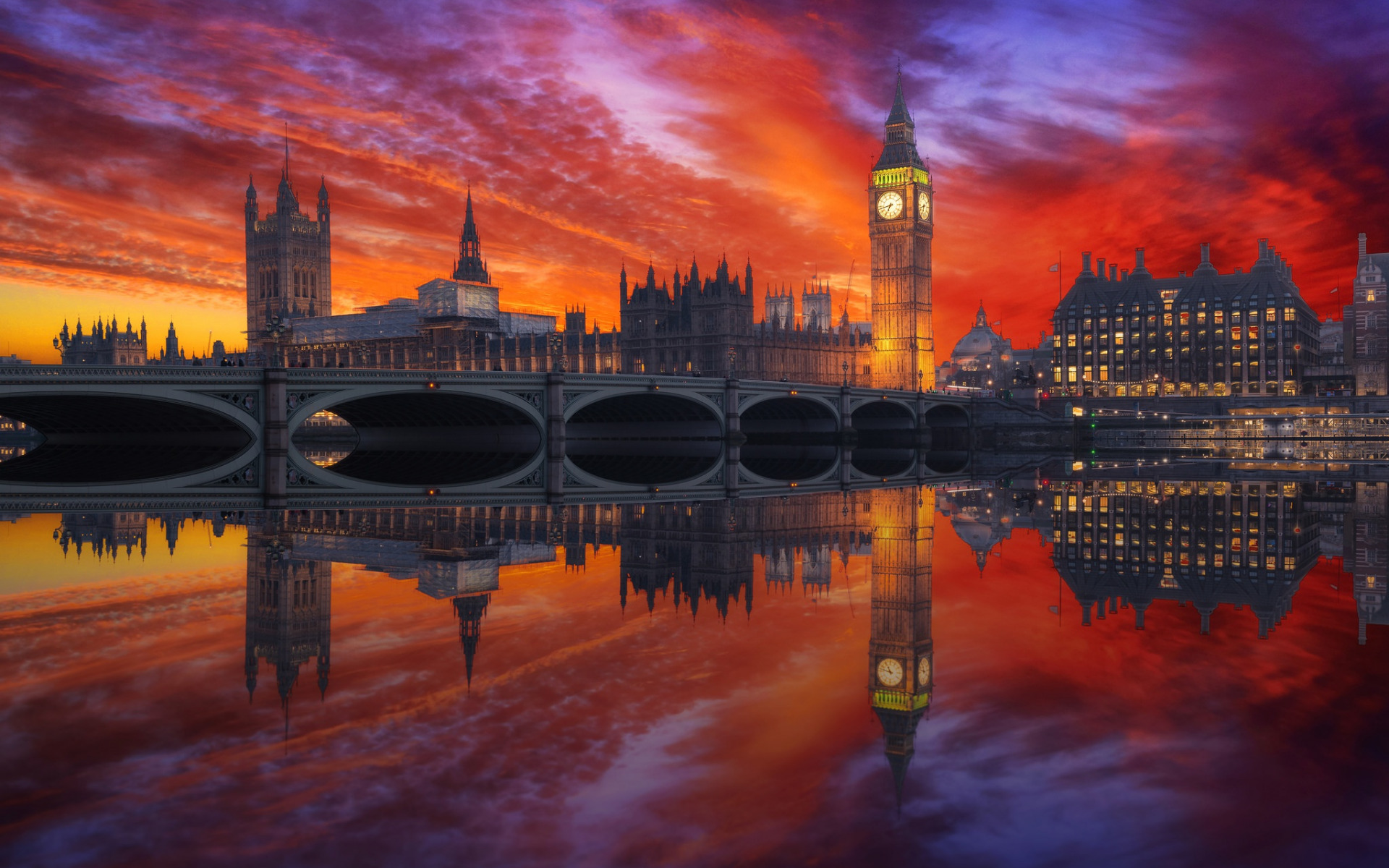 Description: A picture of a city with a clock tower and a bridge over water at sunset or dawn with a reflection of the sky.