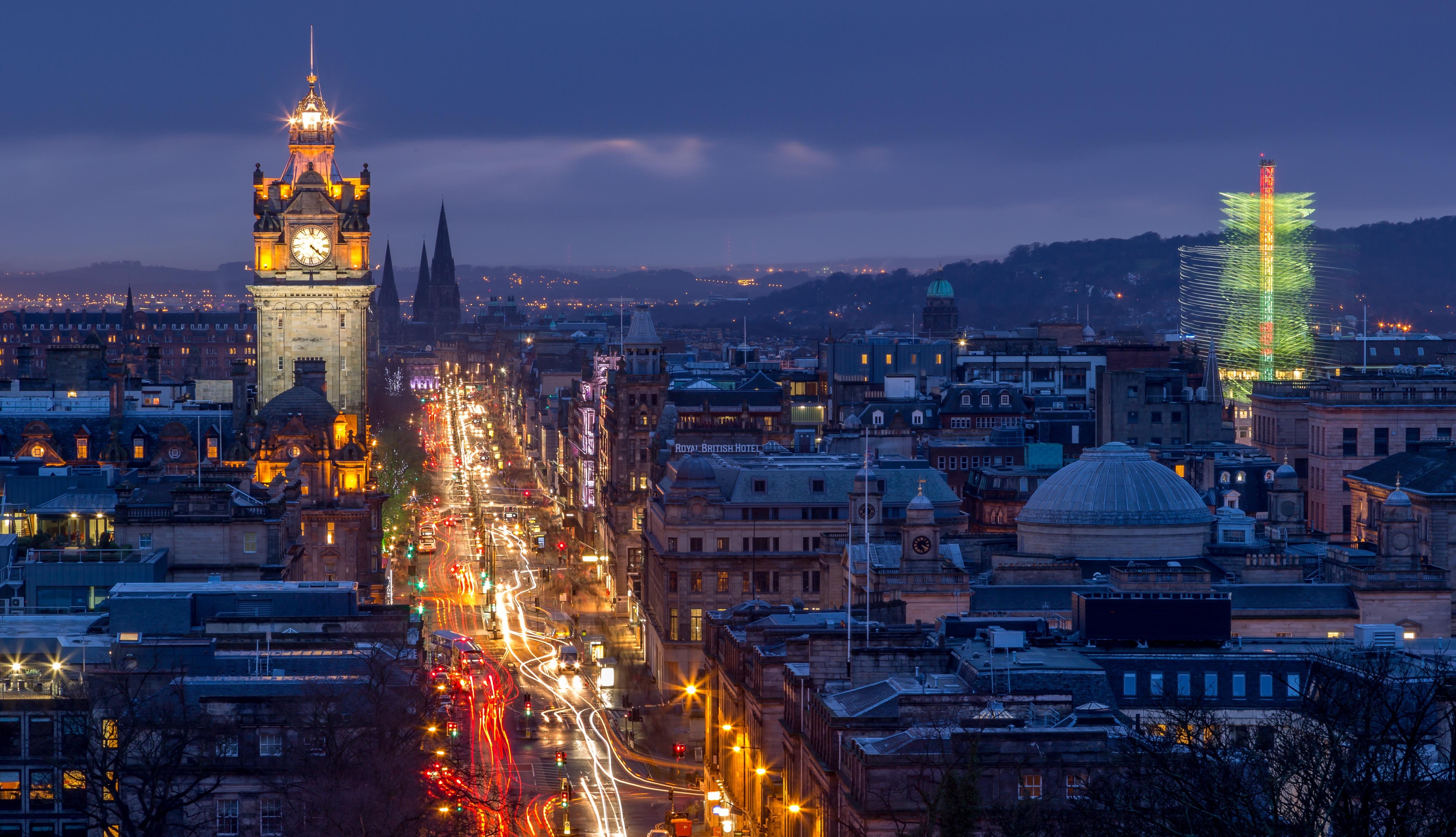 Description: A city with a clock tower and a street with cars on it at night time with lights on the buildings.
