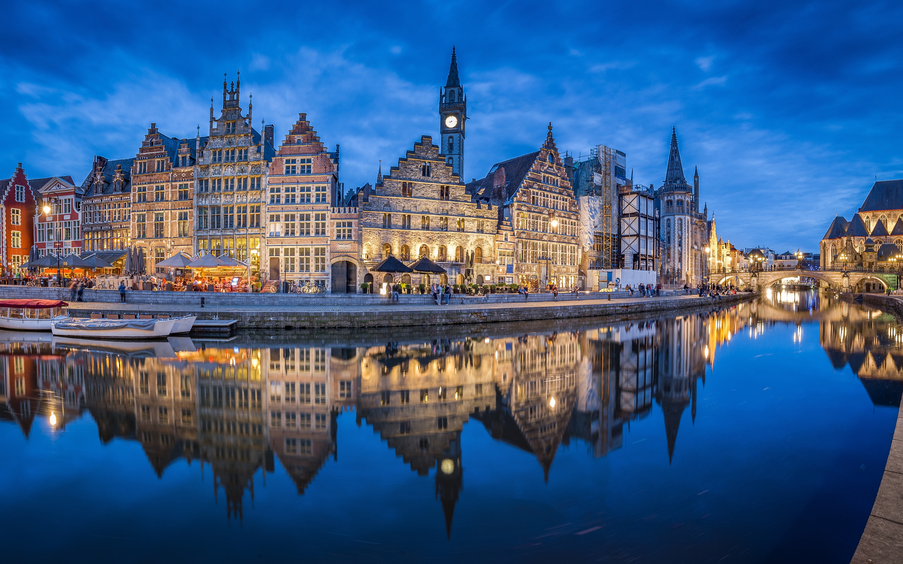 Description: A city with a clock tower and a river in front of it at night time with a blue sky.