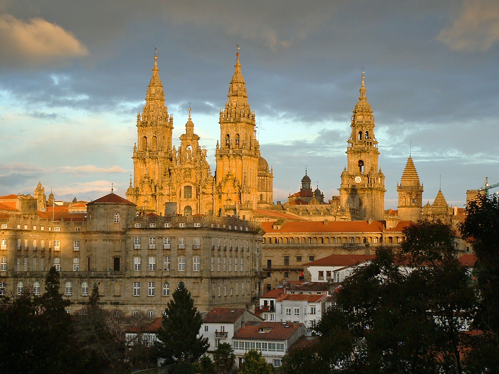 Description: A city with a large building with a clock tower and a sky background with clouds in the sky and a few buildings in the foreground.