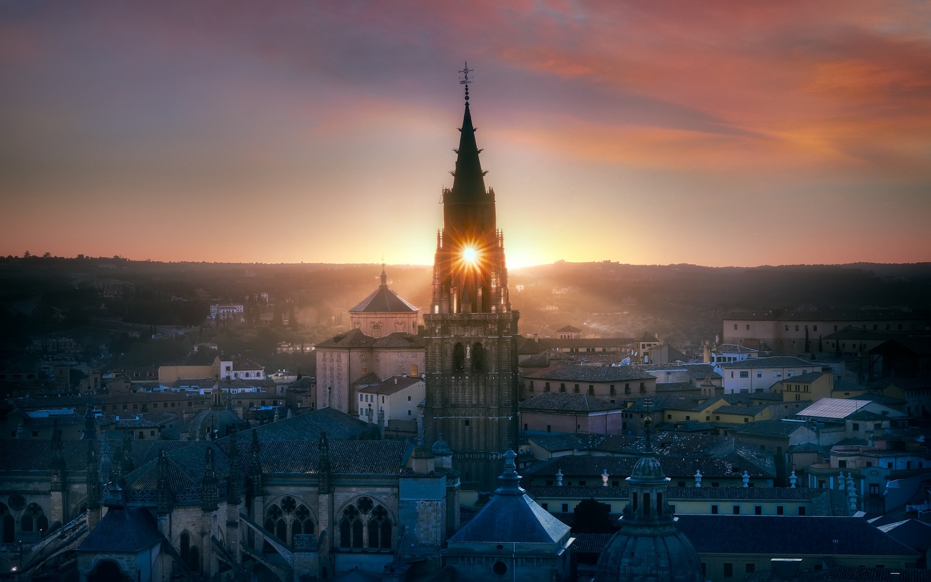 Description: A city with a clock tower and a sunset in the background with clouds in the sky and a sun setting.