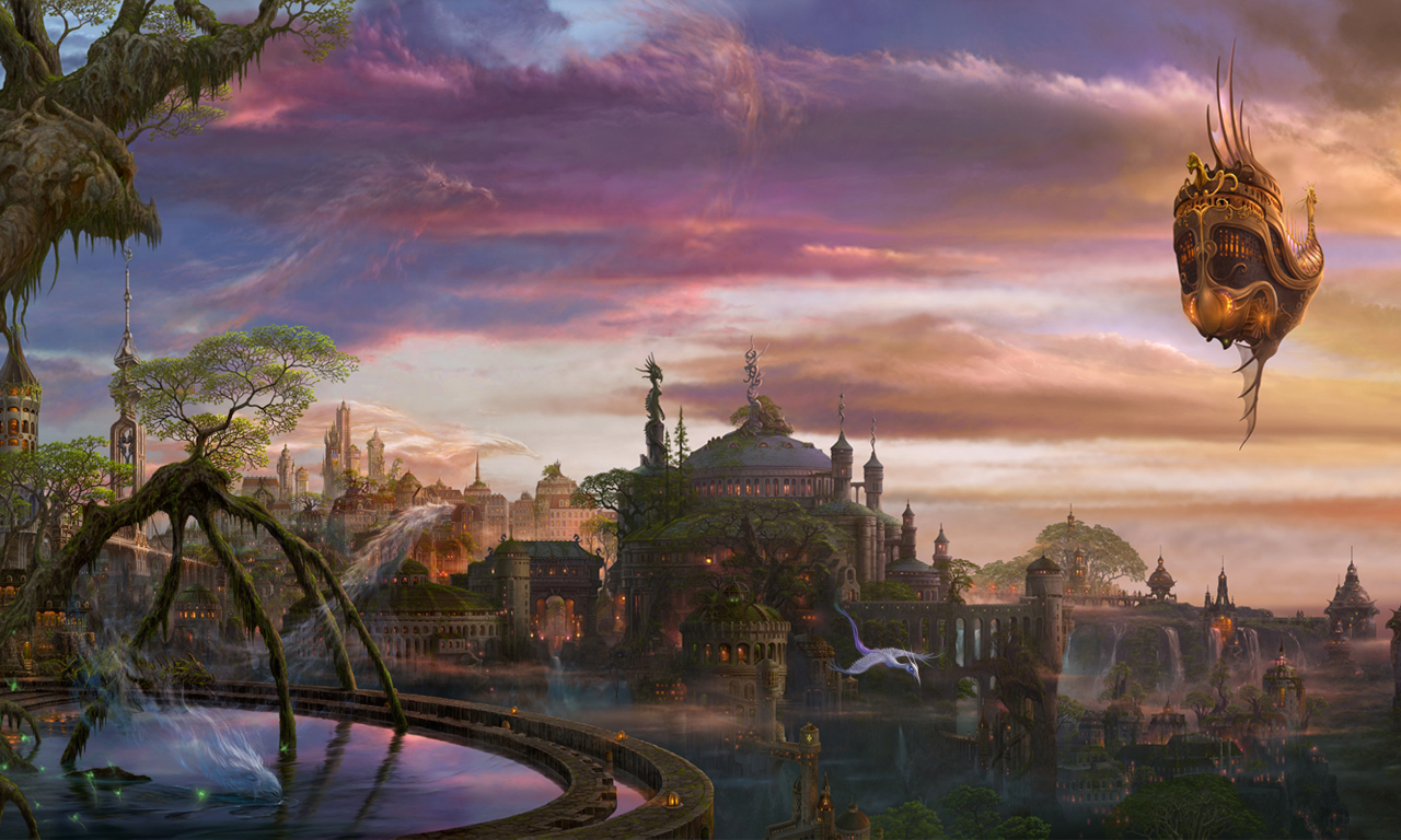 Description: A painting of a city with a dragon flying over it's head and a bird flying over it.