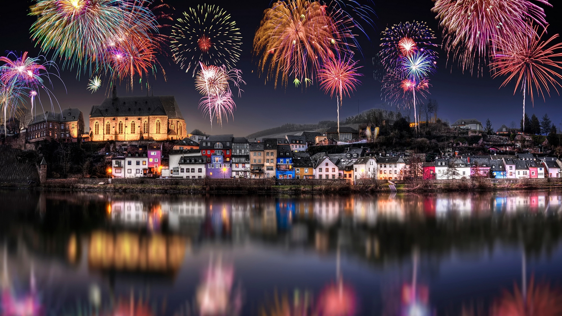 Description: A city with a lot of fireworks in the sky above it and a lake with a lot of water.