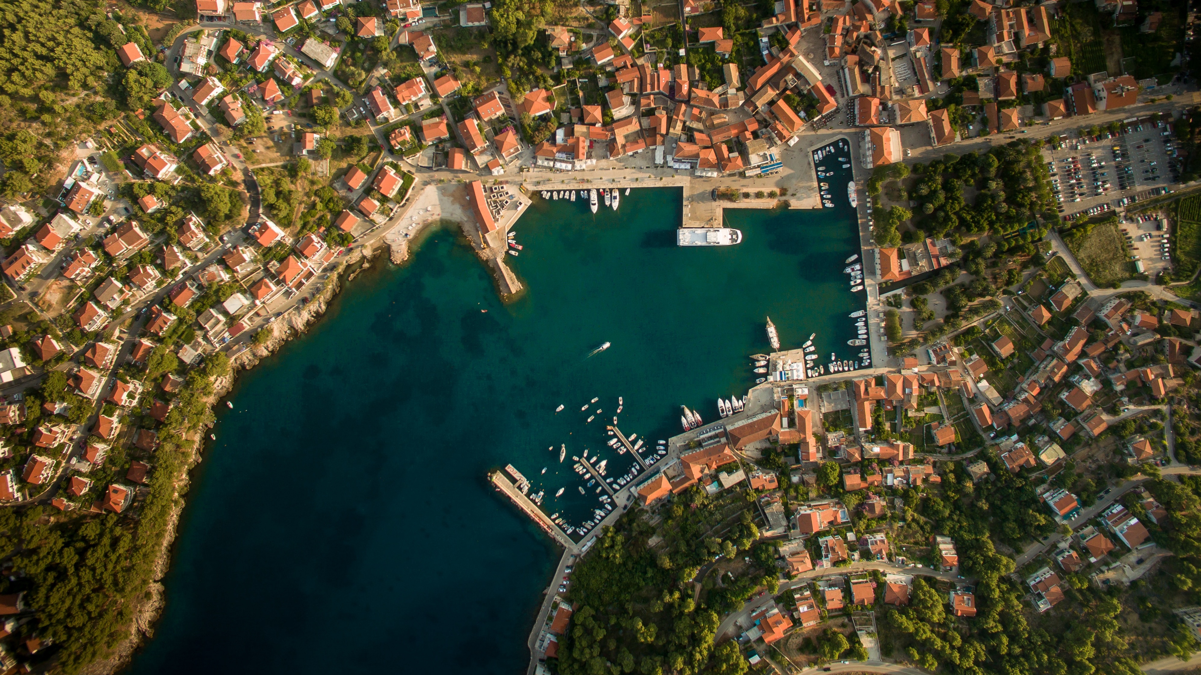 Description: A bird's eye view of a city and a harbor with boats in it and a bridge over the water.
