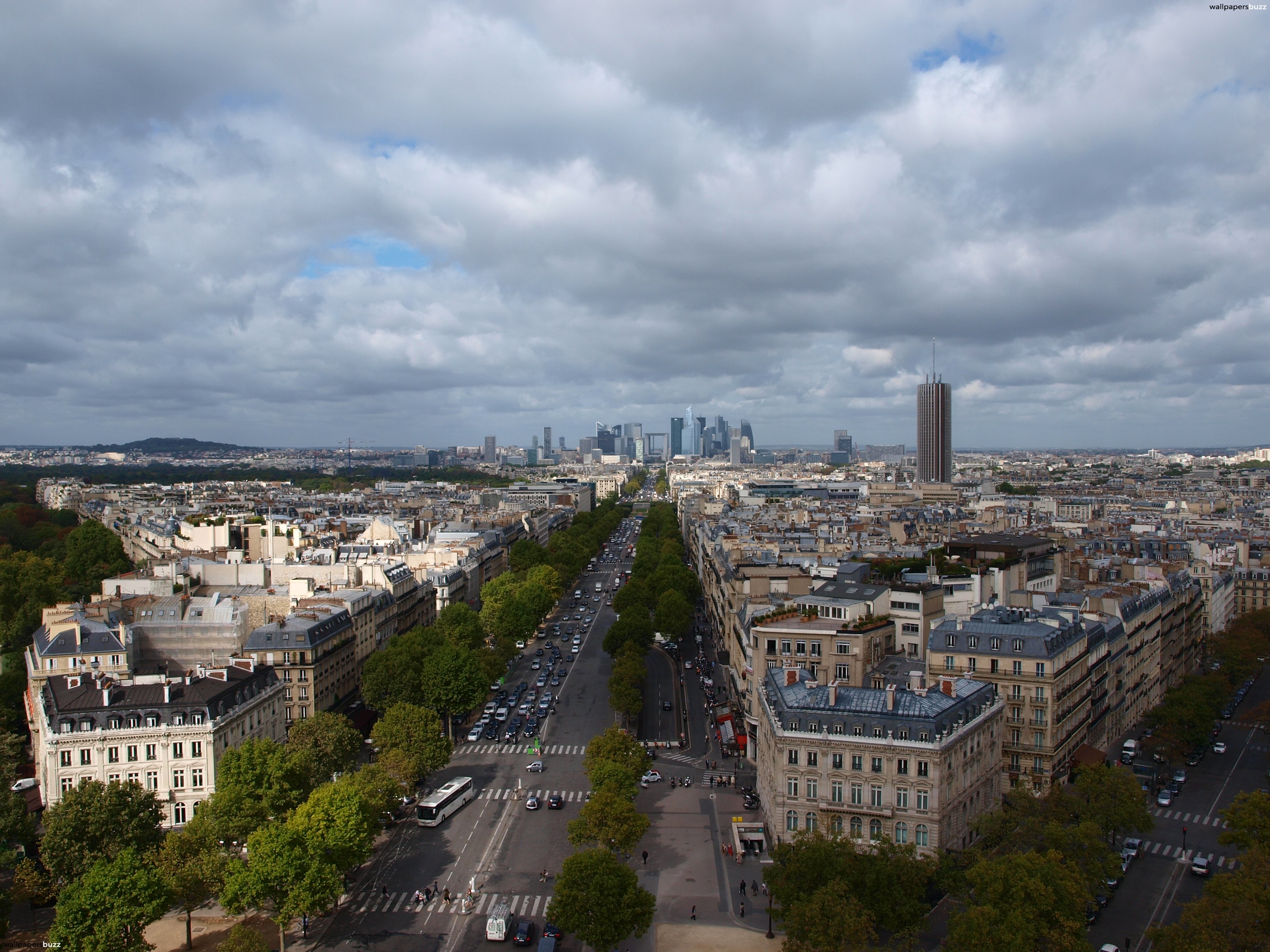 Description: A view of a city from a high viewpoint of a street and buildings in the distance with a cloudy sky.