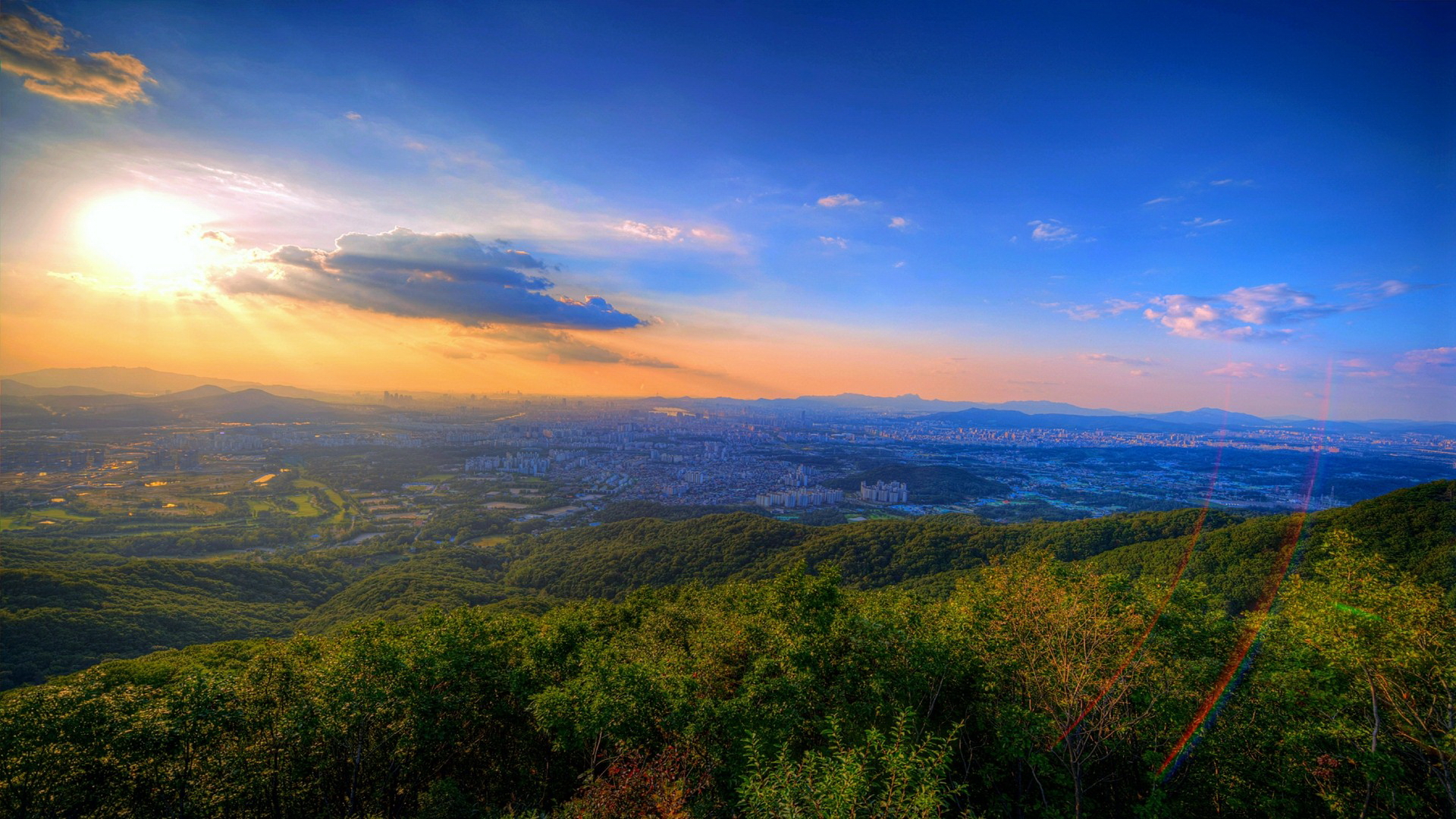 Description: A view of a city from a high hill with a sky background and sun shining through the clouds above.